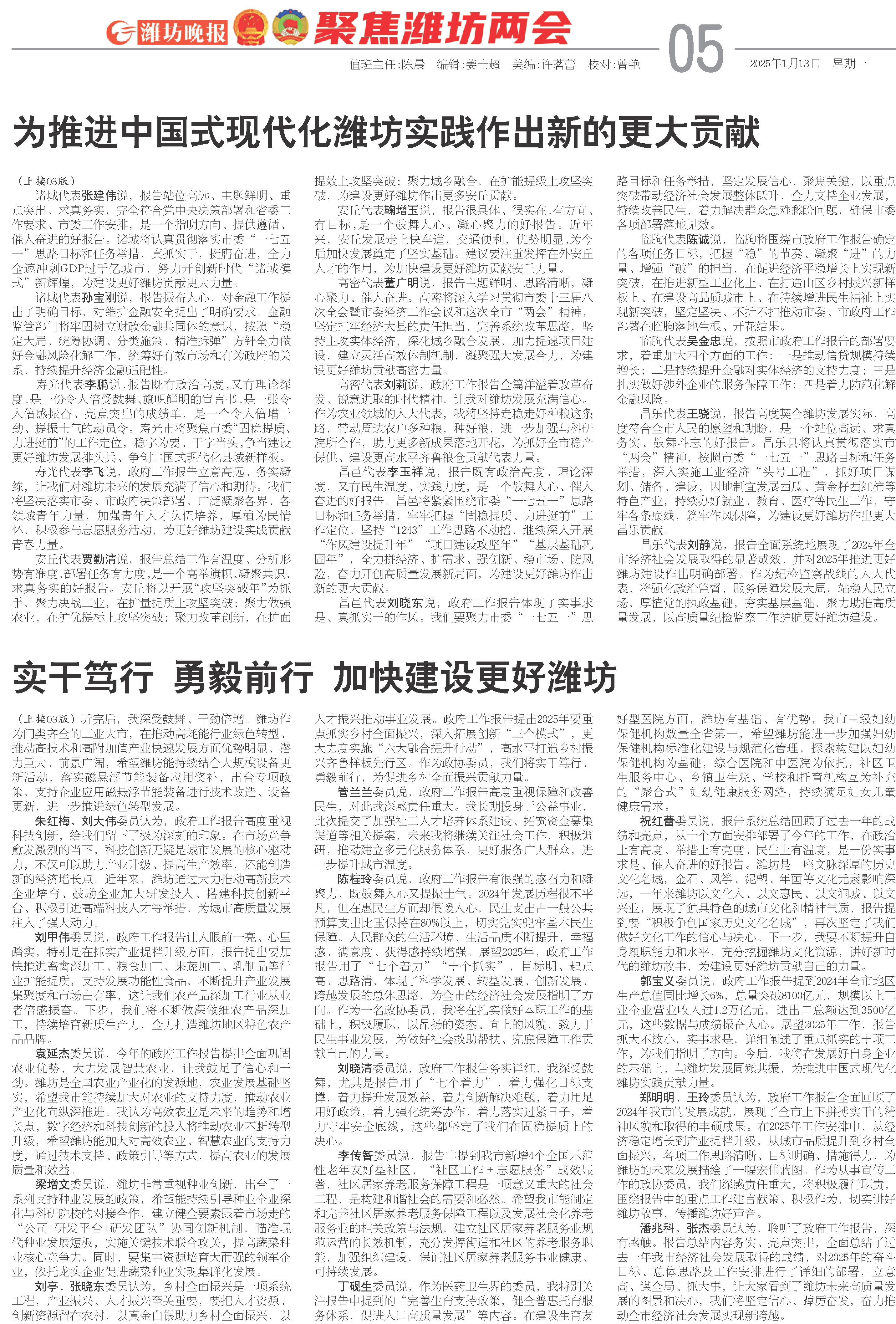 郑明明、王玲委员认为,政府工作报告全面回顾了2024年我市的发展成就,展现了全市上下拼搏实干的精神风貌和取得的丰硕成果。在2025年工作安排中,从经济稳定增长到产业提档升级,从城市品质提升到乡村全面振兴,各项工作思路清晰、目标明确、措施得力,为潍坊的未来发展描绘了一幅宏伟蓝图。作为从事宣传工作的政协委员,我们深感责任重大,将积极履行职责,围绕报告中的重点工作建言献策、积极作为,切实讲好潍坊故事,传播潍坊好声音。