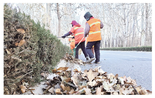 1月14日,在城区宝通西街与利民路交叉口附近,环卫工人在清扫落叶。近来气温骤降,城区落叶量剧增,为保障城市环境整洁,潍坊潍州环卫有限公司组织环卫工人开展了冬季落叶集中清扫行动。 本报记者 宋寿爽