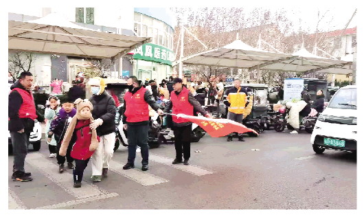 日前,在坊子区凤凰街道双羊社区,退役军人志愿者正在执行护学任务。为守护辖区学生安全,确保高峰时段道路畅通,社区组织退役军人志愿者主动对接学校,指引车辆有序通行,并宣传安全知识,增强学生及家长的安全意识。