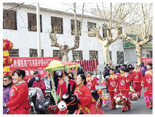 过了腊八节,大集自动升格为年集,迎来一年中最旺的人气。当地更是组织了民俗表演为大集助兴(右图),舞龙、扭秧歌、踩高跷等传统民俗节目轮番上阵,锣鼓喧天,热闹非凡,吸引着人们驻足观看,大家纷纷拿起手机拍下大集上的热闹场景。