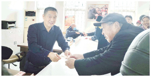 “大爷、大娘,快过年了,每人给你们发120元钱,钱不多,是我的一点心意,买点年货,祝大家健康长寿、过个好年。”颜景雷边说边给老人发钱。
