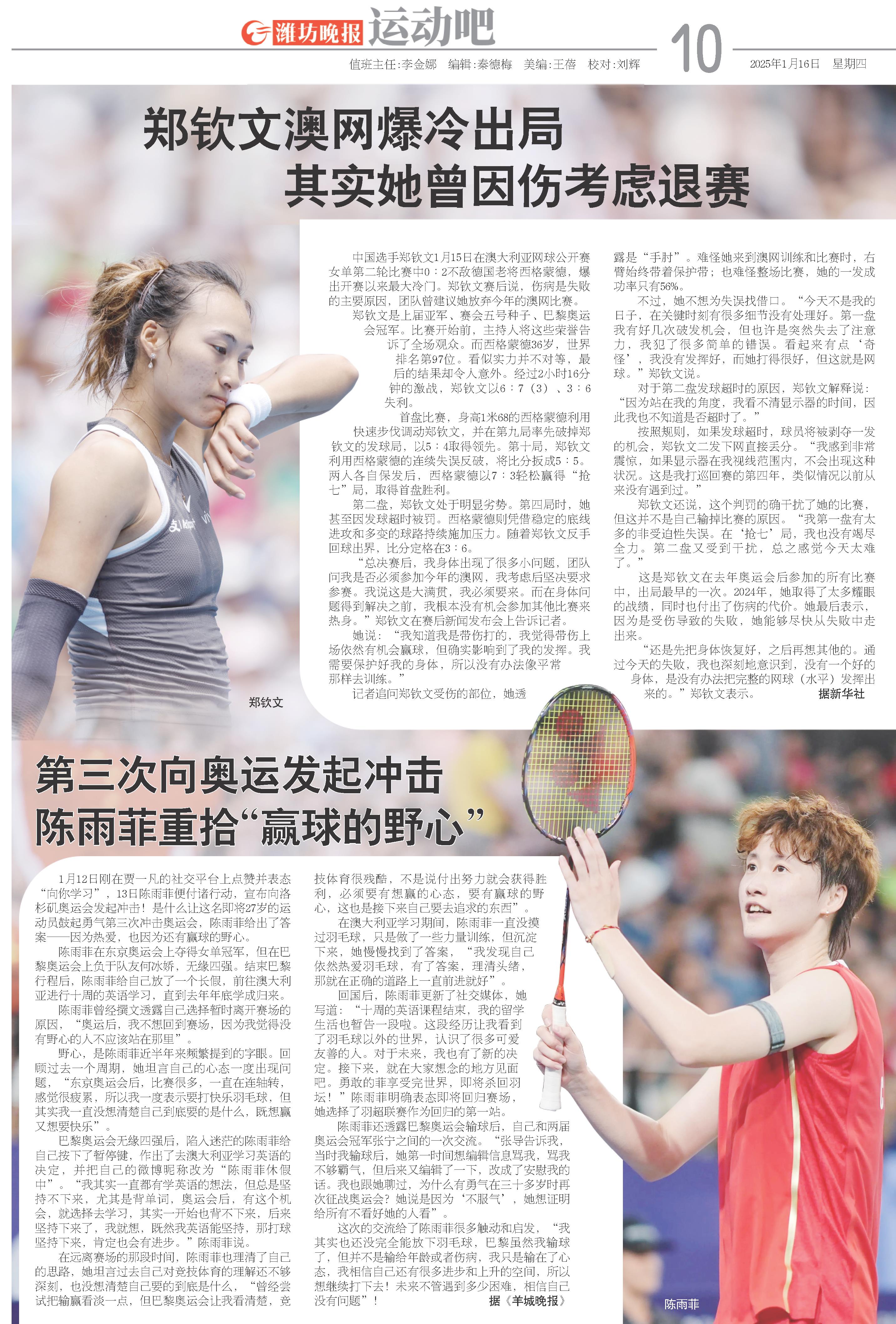 “总决赛后,我身体出现了很多小问题,团队问我是否必须参加今年的澳网,我考虑后坚决要求参赛。我说这是大满贯,我必须要来。而在身体问题得到解决之前,我根本没有机会参加其他比赛来热身。”郑钦文在赛后新闻发布会上告诉记者。