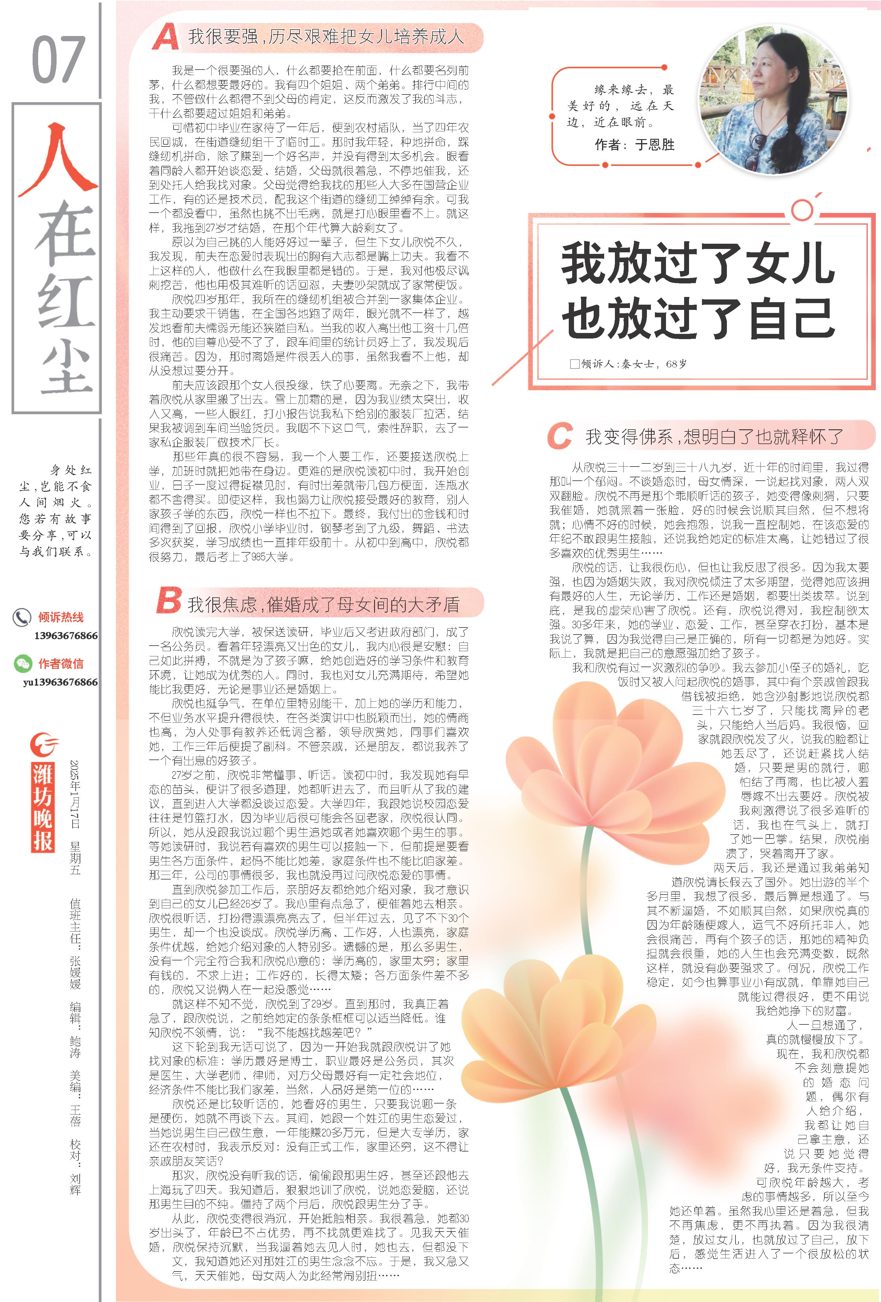 欣悦的话,让我很伤心,但也让我反思了很多。因为我太要强,也因为婚姻失败,我对欣悦倾注了太多期望,觉得她应该拥有最好的人生,无论学历、工作还是婚姻,都要出类拔萃。说到底,是我的虚荣心害了欣悦。还有,欣悦说得对,我控制欲太强。30多年来,她的学业、恋爱、工作,甚至穿衣打扮,基本是我说了算,因为我觉得自己是正确的,所有一切都是为她好。实际上,我就是把自己的意愿强加给了孩子。