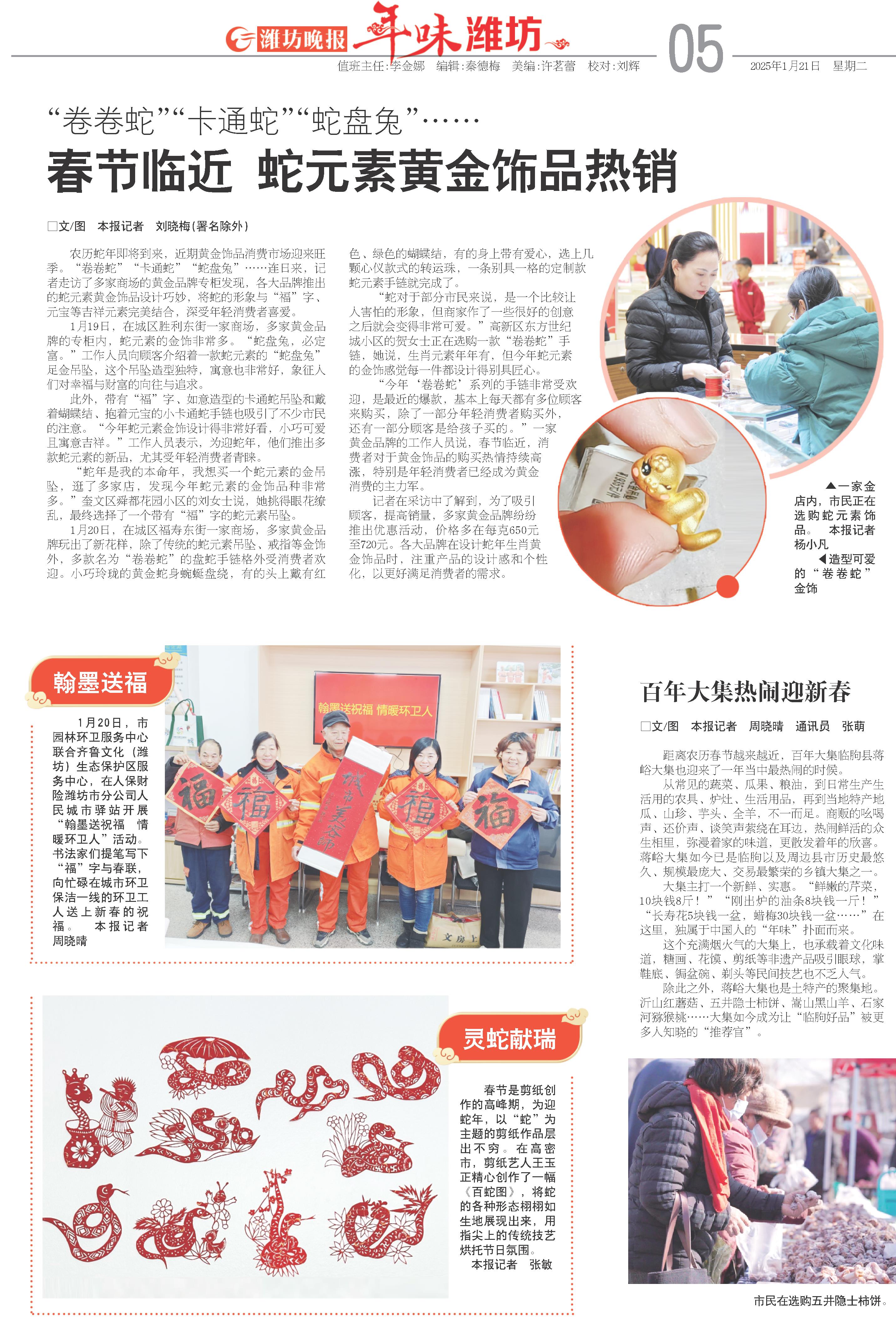 春节是剪纸创作的高峰期,为迎蛇年,以“蛇”为主题的剪纸作品层出不穷。在高密市,剪纸艺人王玉正精心创作了一幅《百蛇图》,将蛇的各种形态栩栩如生地展现出来,用指尖上的传统技艺烘托节日氛围。