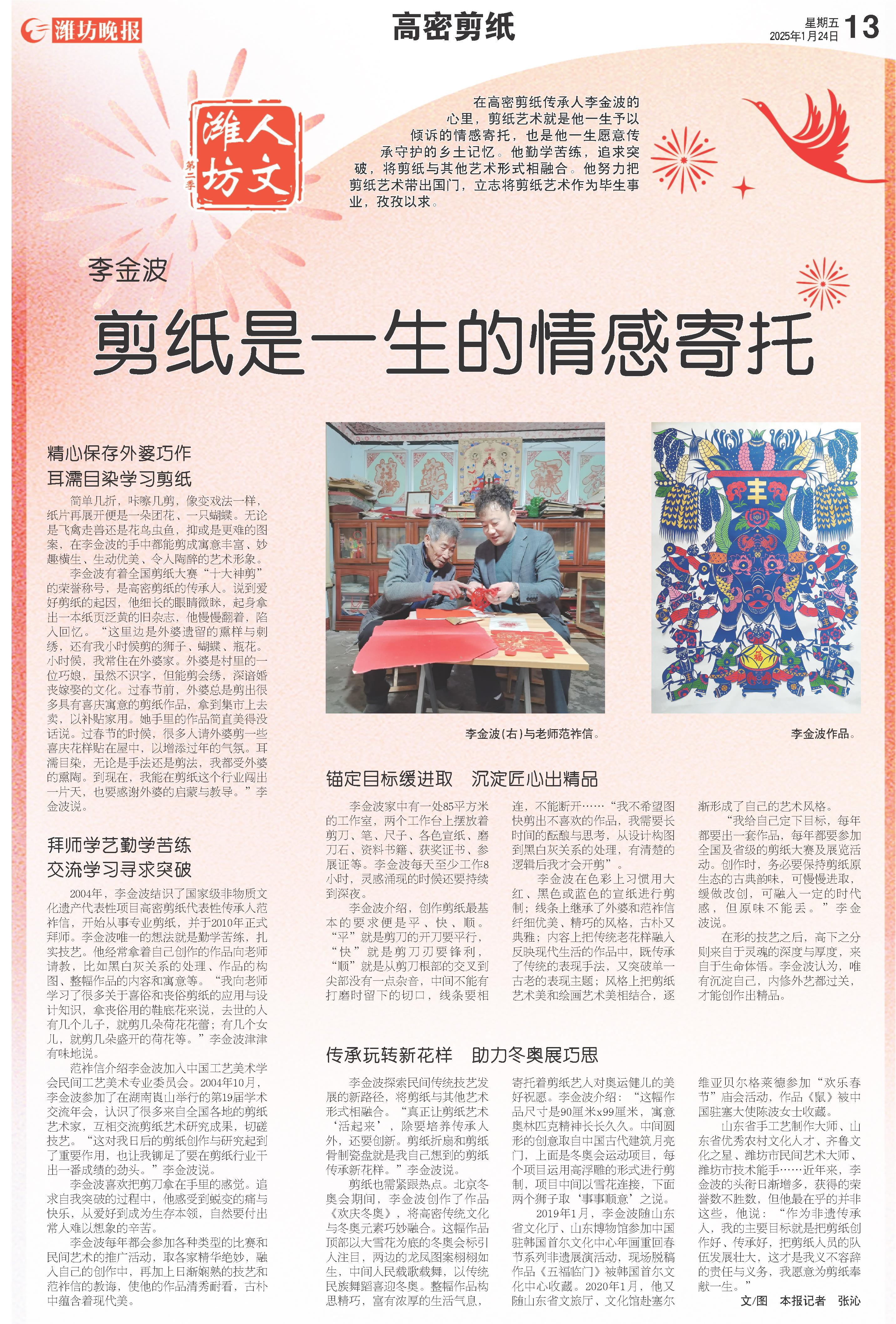 在高密剪纸传承人李金波的心里,剪纸艺术就是他一生予以倾诉的情感寄托,也是他一生愿意传承守护的乡土记忆。他勤学苦练,追求突破,将剪纸与其他艺术形式相融合。他努力把剪纸艺术带出国门,立志将剪纸艺术作为毕生事业,孜孜以求。