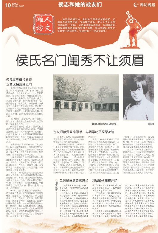 1929年1月,因山东省委王复元、王天生投敌变节,邓恩铭等数十名省委干部被捕入狱,山东省党组织陷入瘫痪。在这危难之际,中央急调武胡景出任山东省委书记,调侯志任山东省委妇女部部长。侯志与丈夫于3月赶赴济南后,立即着手整顿组织,恢复省委妇女工作。