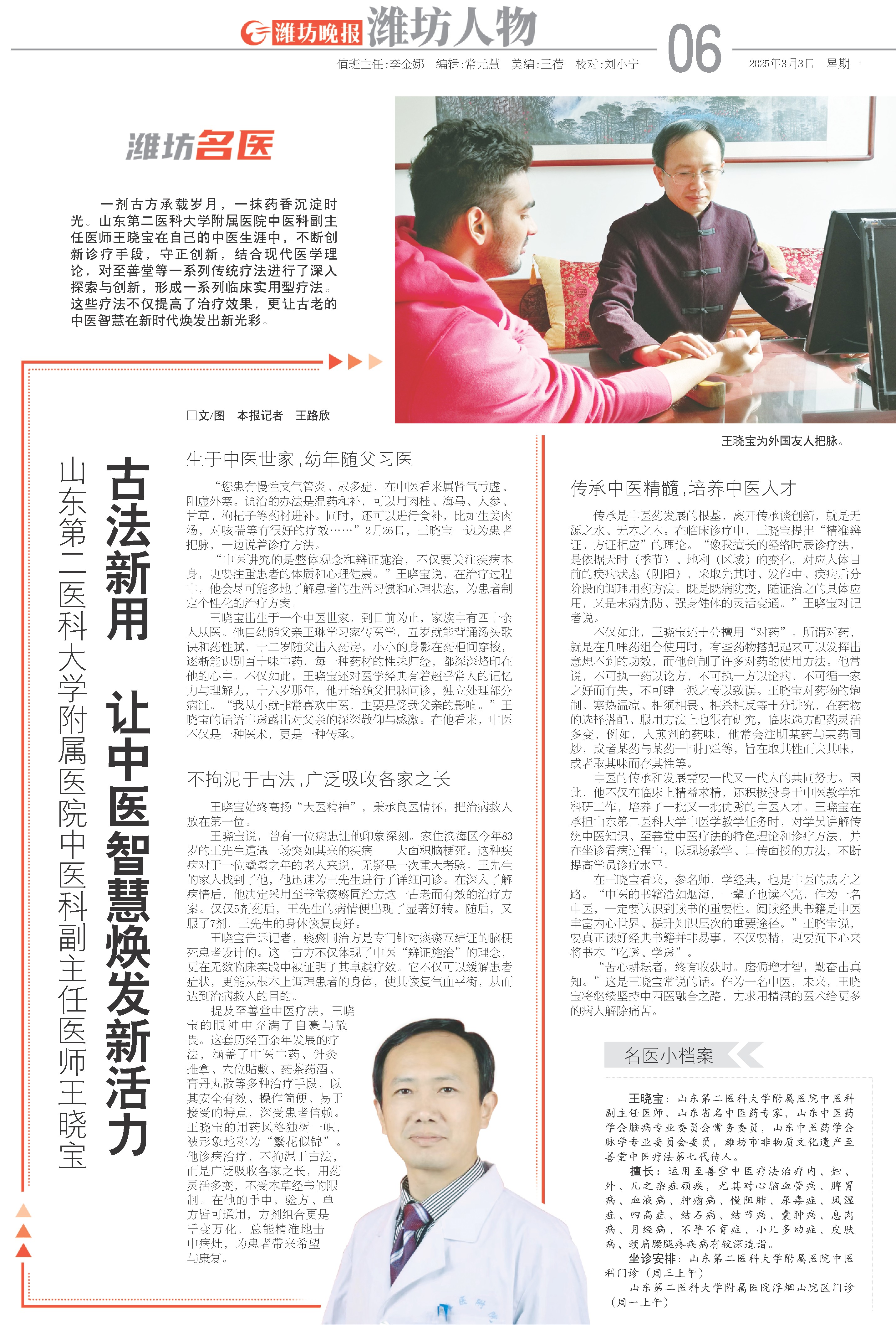 一剂古方承载岁月,一抹药香沉淀时光。山东第二医科大学附属医院中医科副主任医师王晓宝在自己的中医生涯中,不断创新诊疗手段,守正创新,结合现代医学理论,对至善堂等一系列传统疗法进行了深入探索与创新,形成一系列临床实用型疗法。这些疗法不仅提高了治疗效果,更让古老的中医智慧在新时代焕发出新光彩。