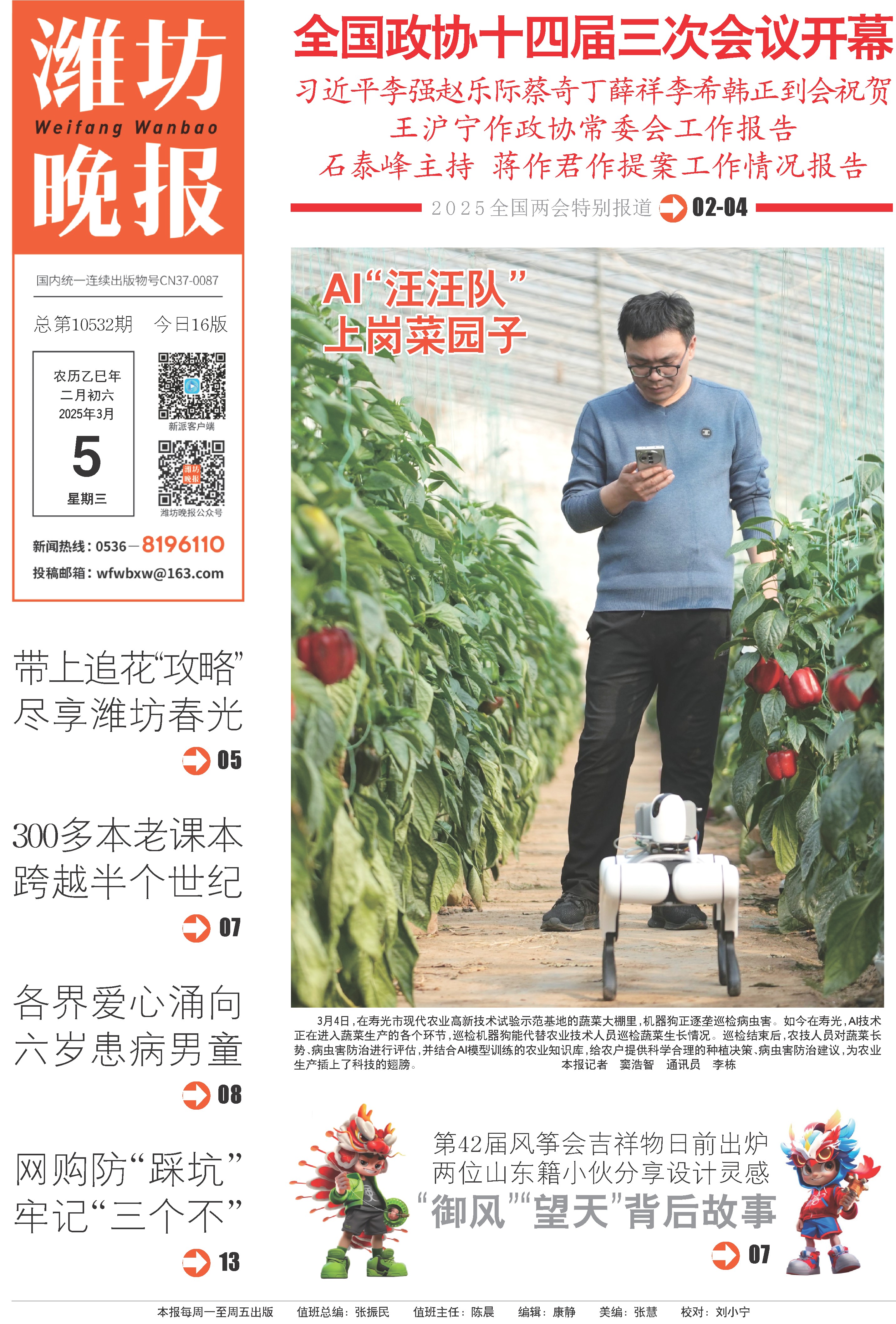 3月4日,在寿光市现代农业高新技术试验示范基地的蔬菜大棚里,机器狗正逐垄巡检病虫害。如今在寿光,AI技术正在进入蔬菜生产的各个环节,巡检机器狗能代替农业技术人员巡检蔬菜生长情况。巡检结束后,农技人员对蔬菜长势、病虫害防治进行评估,并结合AI模型训练的农业知识库,给农户提供科学合理的种植决策、病虫害防治建议,为农业生产插上了科技的翅膀。 本报记者 窦浩智 通讯员 李栋