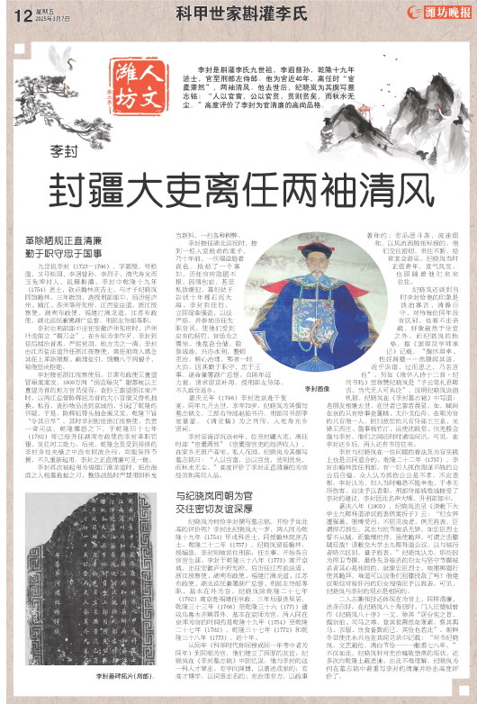 李鋐是斟灌李氏十世祖,乾隆三十年举人,官至广西布政使、护理广西巡抚、顺天府府尹,成为朝廷的二品大员。李鋐以文举入仕,却军功赫赫。兵部尚书、内阁学士兼礼部侍郎初彭龄为其撰写墓志铭文,称其“入总百僚,出治三军”,赞其文武兼备。