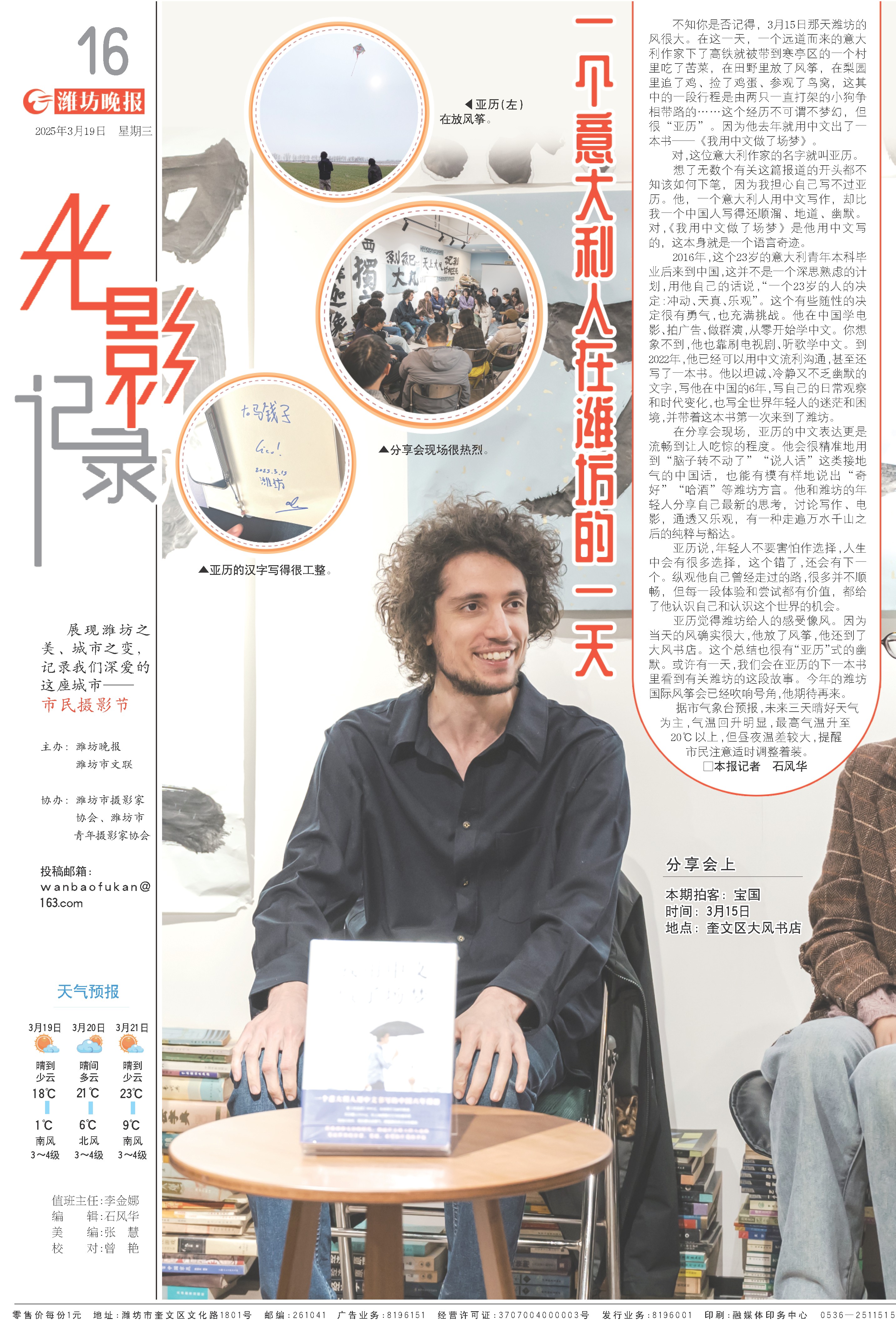 不知你是否记得,3月15日那天潍坊的风很大。在这一天,一个远道而来的意大利作家下了高铁就被带到寒亭区的一个村里吃了苦菜,在田野里放了风筝,在梨园里追了鸡、捡了鸡蛋、参观了鸟窝,这其中的一段行程是由两只一直打架的小狗争相带路的……这个经历不可谓不梦幻,但很“亚历”。因为他去年就用中文出了一本书——《我用中文做了场梦》。
