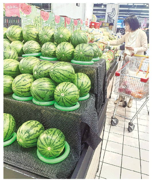 除了各种小西瓜,市场上也有国外进口的大甜王西瓜,每斤4元钱,商户把几个西瓜切开,红红的瓜瓤格外诱人。