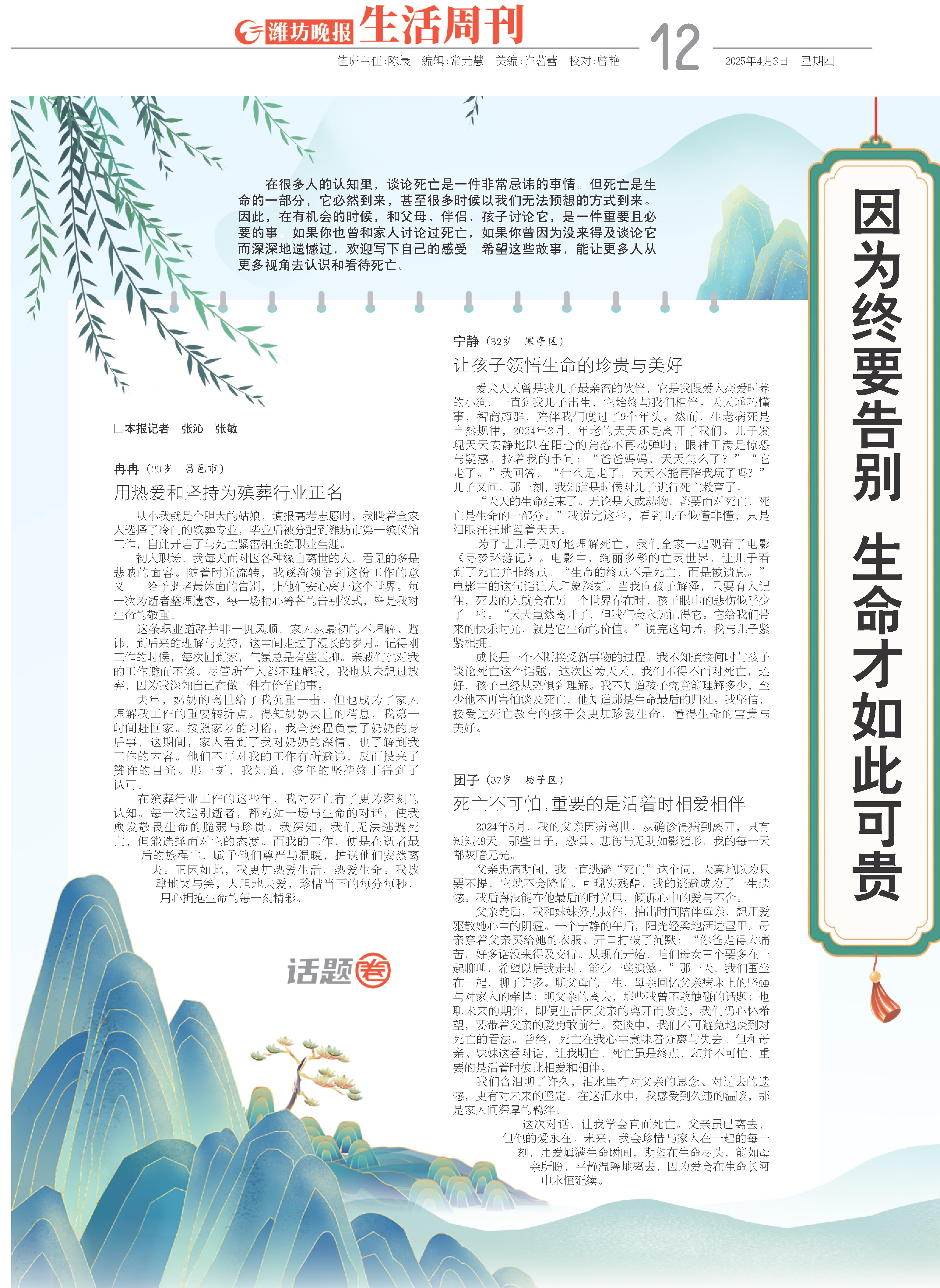 在殡葬行业工作的这些年,我对死亡有了更为深刻的认知。每一次送别逝者,都宛如一场与生命的对话,使我愈发敬畏生命的脆弱与珍贵。我深知,我们无法逃避死亡,但能选择面对它的态度。而我的工作,便是在逝者最后的旅程中,赋予他们尊严与温暖,护送他们安然离去。正因如此,我更加热爱生活,热爱生命。我放肆地哭与笑,大胆地去爱,珍惜当下的每分每秒,用心拥抱生命的每一刻精彩。