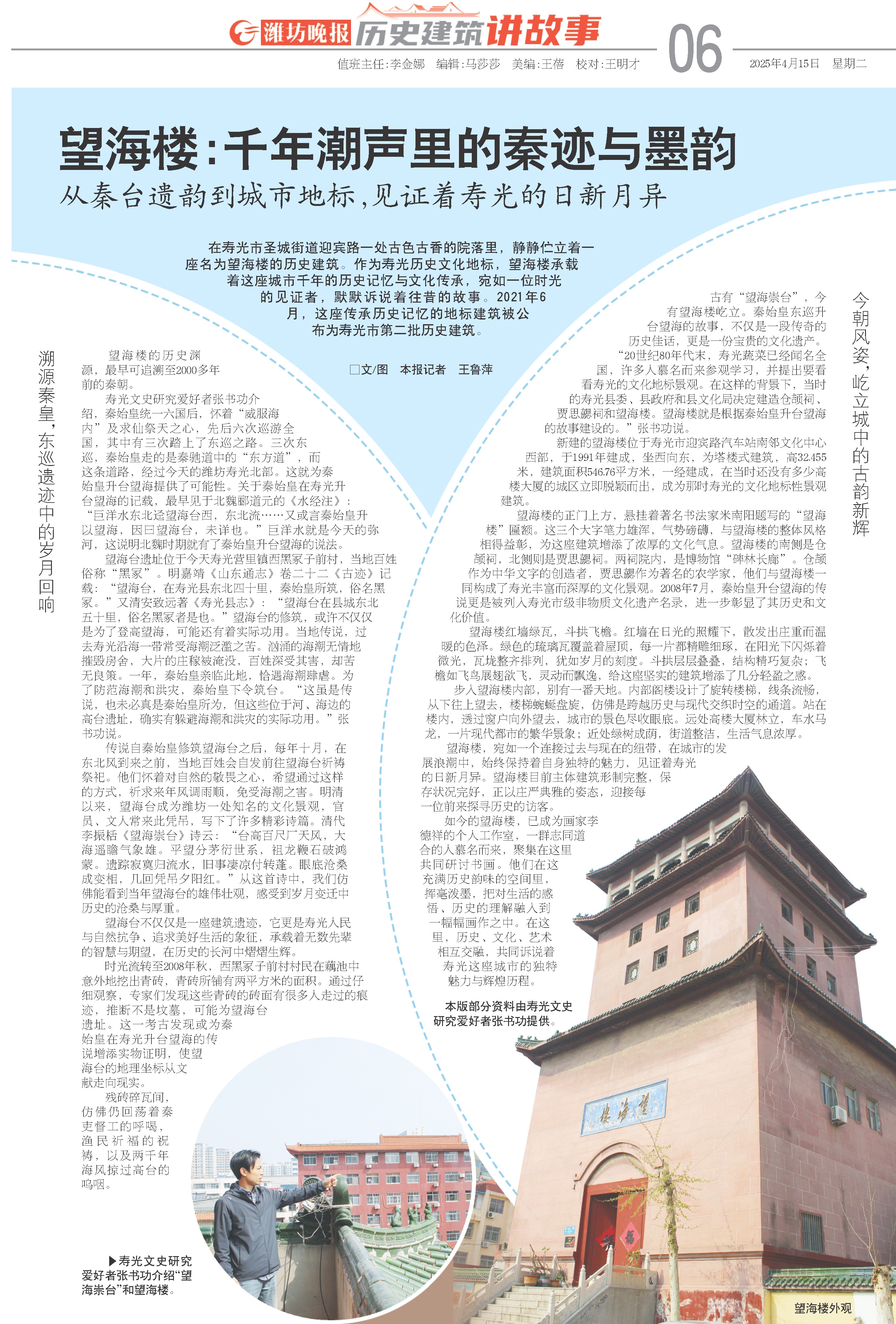 在寿光市圣城街道迎宾路一处古色古香的院落里,静静伫立着一座名为望海楼的历史建筑。作为寿光历史文化地标,望海楼承载着这座城市千年的历史记忆与文化传承,宛如一位时光的见证者,默默诉说着往昔的故事。2021年6月,这座传承历史记忆的地标建筑被公布为寿光市第二批历史建筑。