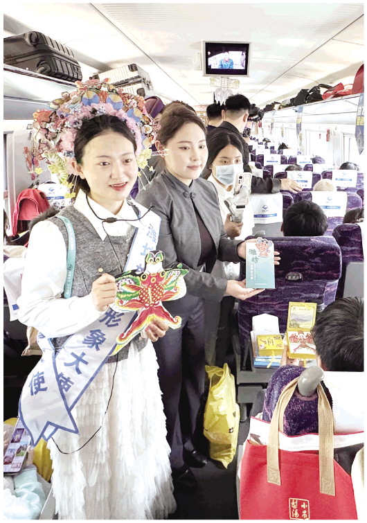 4月16日,在“潍坊风筝号”旅游专线列车车厢里,潍坊旅游形象大使张初韦(左一)向旅客介绍潍坊风筝传统文化。当日12时31分,G1069次列车从北京南站驶出,驶向潍坊,这是首趟从北京始发的“潍坊风筝号”旅游专线列车。该列车以“放飞梦想 拥抱和平”为主题,融合风筝文化、非遗展示和旅游推广,打造沉浸式风筝主题列车体验。 本报记者 张驰