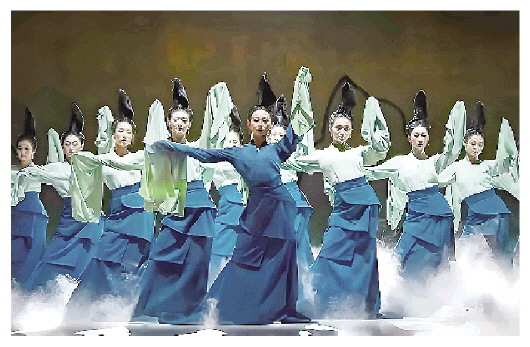 以舞台重现大宋美学,使历经千年色彩依然的《千里江山图》从橱窗展示登上艺术舞台。舞蹈诗剧《只此青绿》借助地面四层转台、空中三层轨道等精妙的舞台装置,营造了山水画高远、深远、平远几个维度的有序交错,以美的方式传递东方美学的概念。