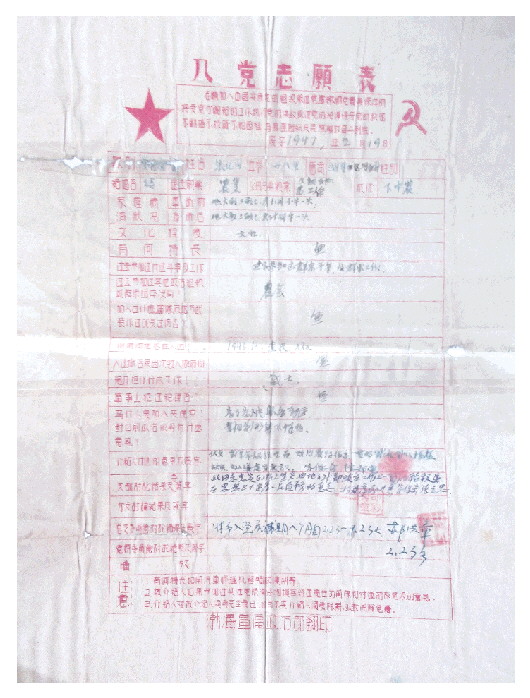 张化山在部队一年多,身边只有几个战友能书写。他要求入党,但识字不多,填写志愿表时,请仅念过三年书的文书代笔。填完后上交,立即被退了回来,原来,“文化程度”栏里“文盲”二字写成了“文忙”。这表不能有错别字,且不能涂改。他就辗转找人重新代填,四天后上级批复“准予入党”。1947年2月19日,是张化山入党的日子,退回的表就成为个人收藏,用来省察自己的言行是否符合表上“为什么要加入共产党”栏里他填写的“为了为人民服务到底”、在“对目前政治形势有什么意见”栏里他填写的“对目前形势不惧怕”。他用这张表鼓舞自己的革命决心和斗志。