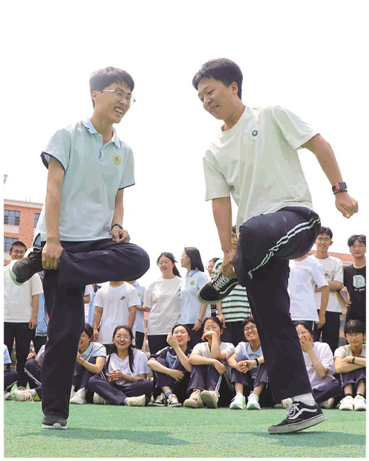 高考临近,高密市一所学校在做好高三学生复习备考的同时,开展多种形式的集体减压活动,帮助学生们释放紧张情绪,以轻松、乐观、自信的心态迎接高考。图为该校高三学生在操场上进行斗拐游戏。