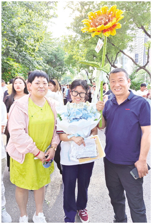 6月10日下午,在潍坊七中考点外,家长迎接考生顺利完成考试,送上捧花和寓意“一举夺魁”的向日葵。当日下午5时许,为期四天的2025年高考正式落下帷幕。考生迈着轻松的步伐走出考场,与早已等候在考点外的家长热情相拥。 本报记者 宋寿爽