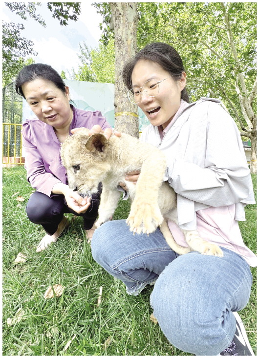6月16日,在城区金宝乐园,一名游客(右)在饲养员的指导下和小狮子亲密接触。当日,在金宝乐园,一只出生46天的小狮子正式与游客见面。小狮子面对陌生的游客毫不畏惧,时而乖巧活泼,时而憨态可掬,萌翻众人。 本报记者 张驰