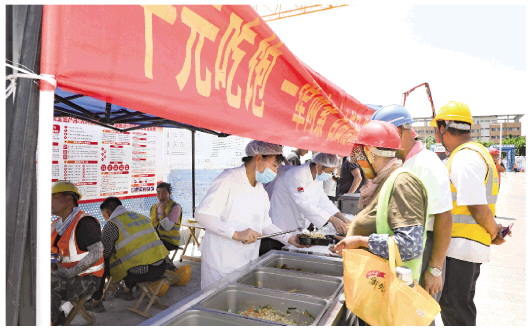 “10元钱能吃上一荤两素,米饭、馒头管够,比在外面吃实惠还干净!而且免费提供绿豆汤。”6月16日中午,在奎文区东风里项目工地的配餐点前,来自哈尔滨的建筑工人冯云波端着热气腾腾的餐盒,脸上满是笑意。这是奎文区住建局在此开展的建筑工地工人配餐服务(右图),让百余名工友在工地上吃出了“家”的味道。截至目前,东风里、潍州风华、橙园等9个项目已全面推广配餐服务,惠及1800余名建筑工人。