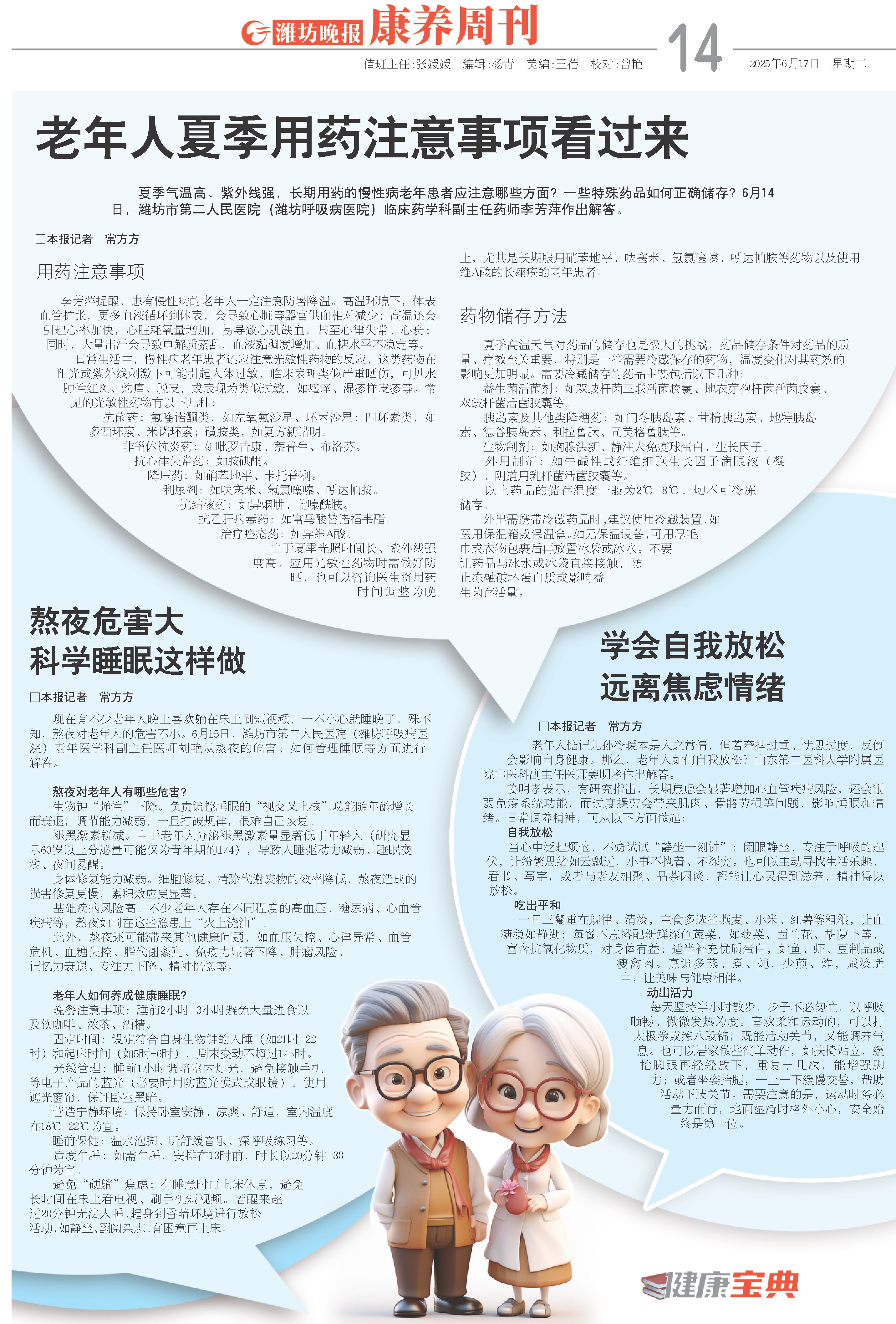 夏季气温高、紫外线强,长期用药的慢性病老年患者应注意哪些方面?一些特殊药品如何正确储存?6月14日,潍坊市第二人民医院(潍坊呼吸病医院)临床药学科副主任药师李芳萍作出解答。
