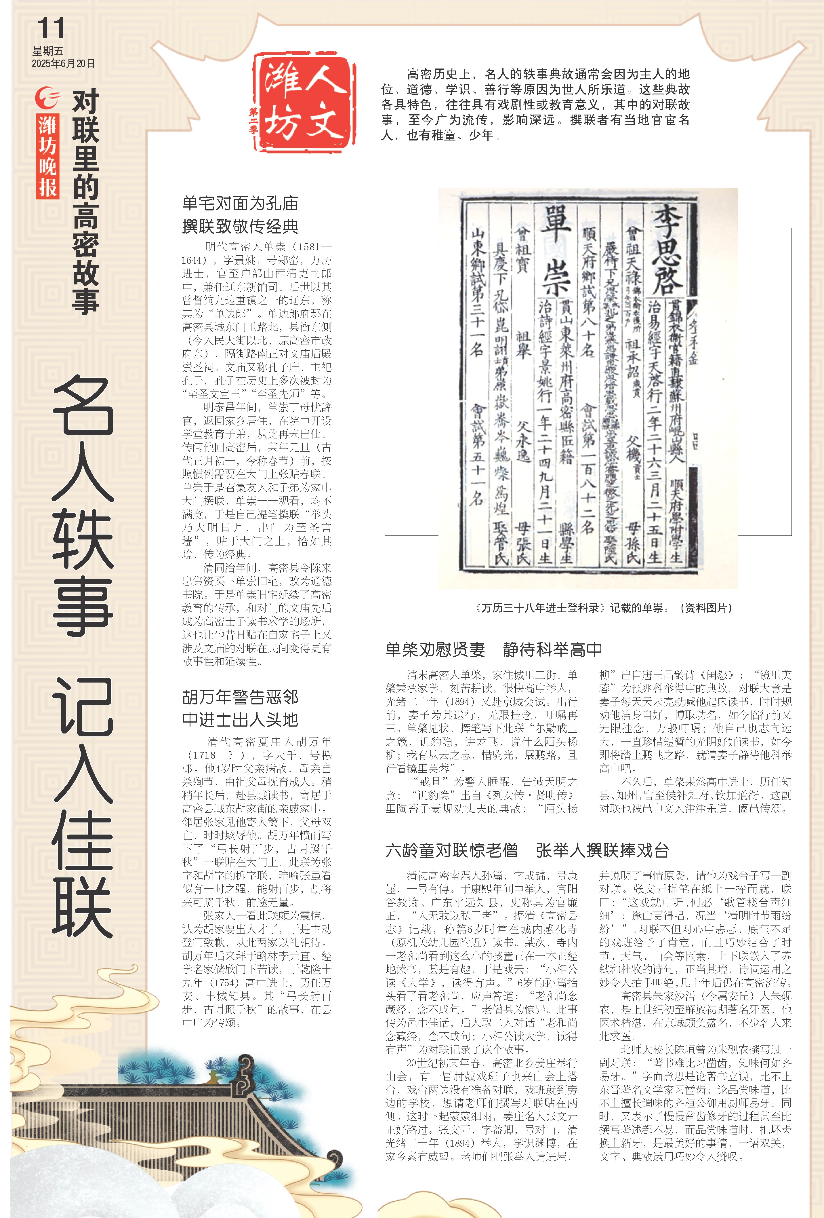 高密历史上,名人的轶事典故通常会因为主人的地位、道德、学识、善行等原因为世人所乐道。这些典故各具特色,往往具有戏剧性或教育意义,其中的对联故事,至今广为流传,影响深远。撰联者有当地官宦名人,也有稚童、少年。