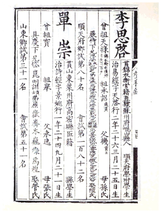 明代高密人单崇(1581—1644),字景姚,号郑窑,万历进士,官至户部山西清吏司郎中,兼任辽东新饷司。后世以其曾督饷九边重镇之一的辽东,称其为“单边郎”。单边郎府邸在高密县城东门里路北,县衙东侧(今人民大街以北,原高密市政府东),隔街路南正对文庙后殿崇圣祠。文庙又称孔子庙,主祀孔子,孔子在历史上多次被封为“至圣文宣王”“至圣先师”等。