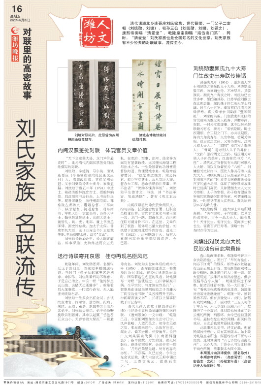 清代诸城北乡逄哥庄刘氏家族,世代簪缨,一门父子二宰相(刘统勋、刘墉)、祖孙三公(刘统勋、刘墉、刘镮之),康熙帝御赐“清爱堂”,乾隆皇帝御赐“海岱高门第”。同时,“清爱堂”刘氏家族也是全国知名的文化世家,刘氏家族有不少经典的对联故事,流传至今。