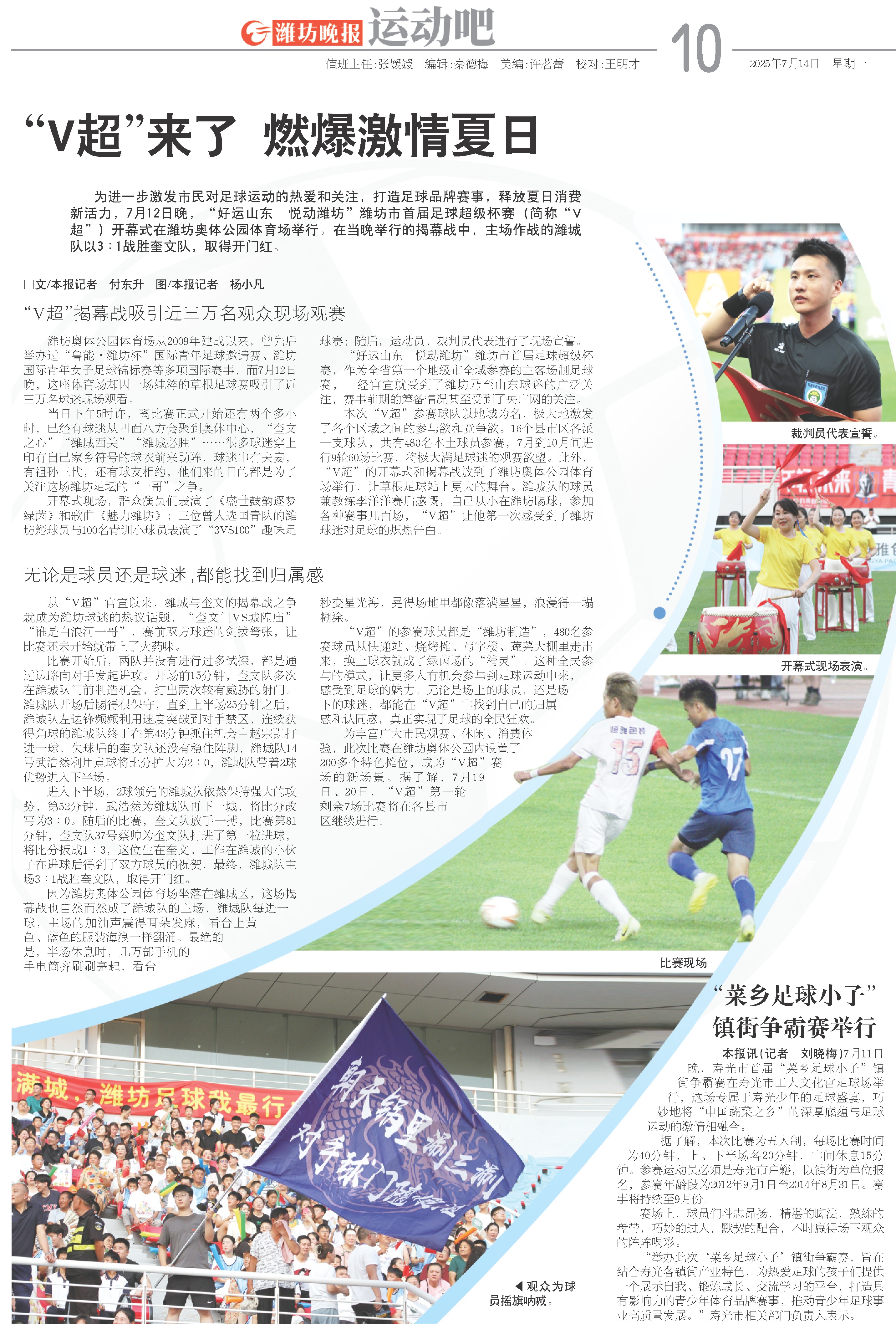 本报讯(记者 刘晓梅)7月11日晚,寿光市首届“菜乡足球小子”镇街争霸赛在寿光市工人文化宫足球场举行,这场专属于寿光少年的足球盛宴,巧妙地将“中国蔬菜之乡”的深厚底蕴与足球运动的激情相融合。