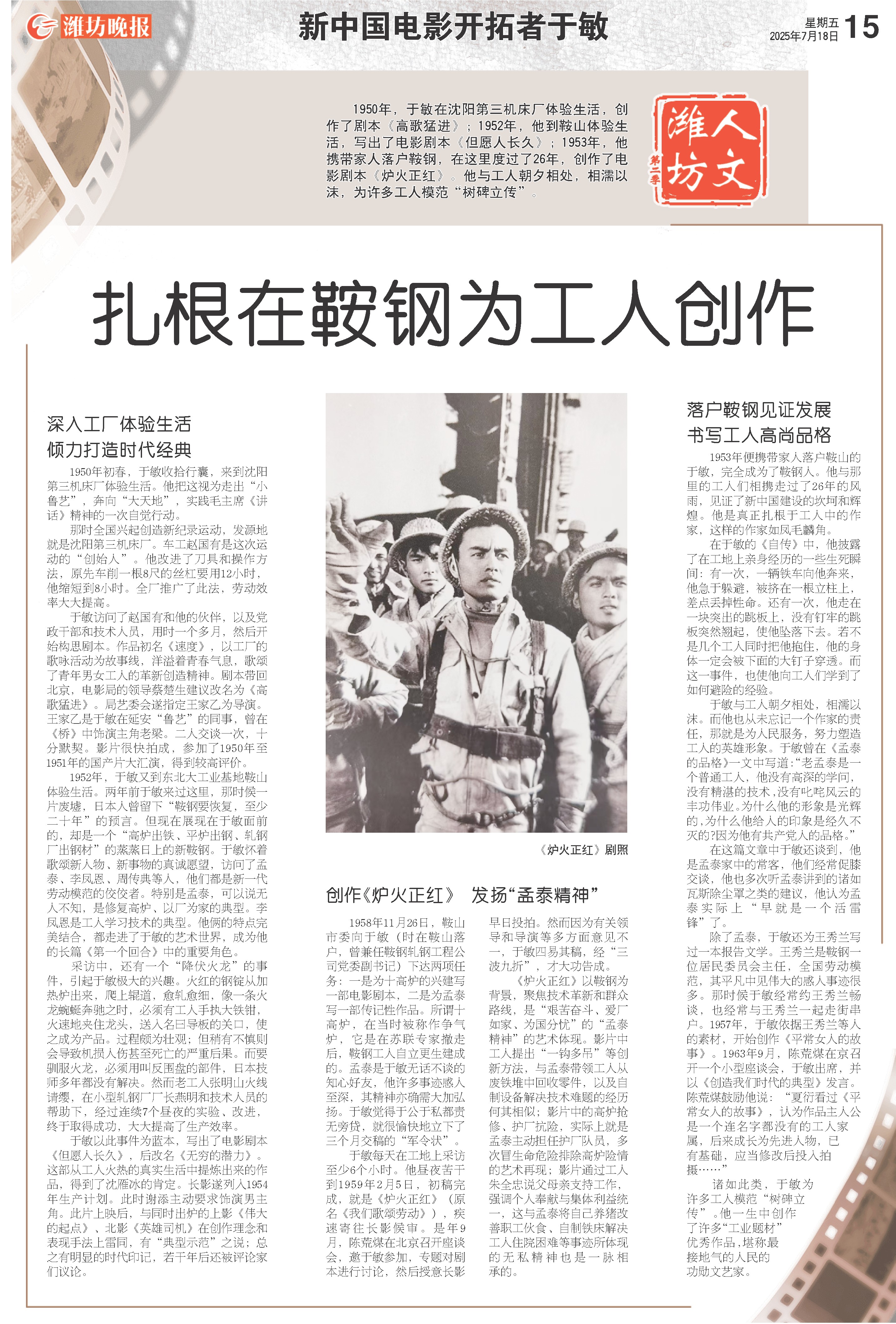 1950年,于敏在沈阳第三机床厂体验生活,创作了剧本《高歌猛进》;1952年,他到鞍山体验生活,写出了电影剧本《但愿人长久》;1953年,他携带家人落户鞍钢,在这里度过了26年,创作了电影剧本《炉火正红》。他与工人朝夕相处,相濡以沫,为许多工人模范“树碑立传”。