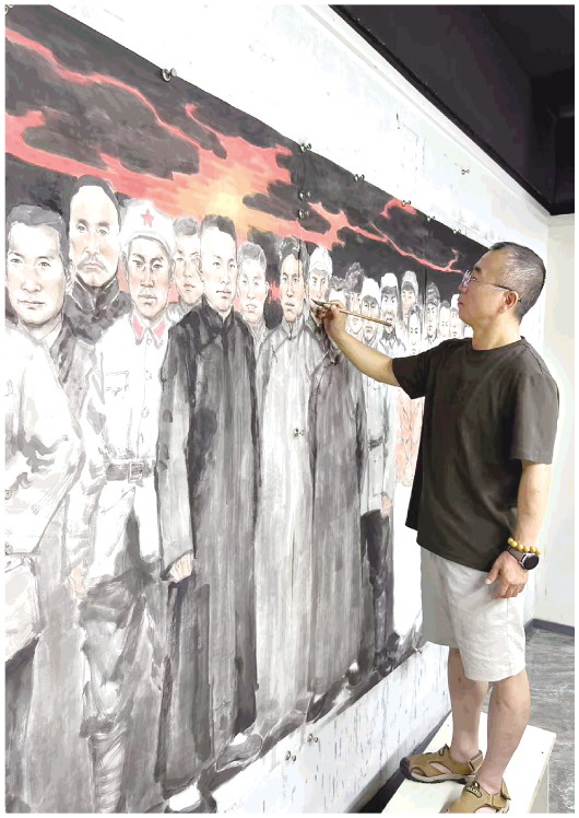 8月12日上午,在坊子区刘克强的画室,中国美术家协会会员刘克强正在对画作进行调整。为纪念中国人民抗日战争暨世界反法西斯战争胜利80周年,刘克强创作了一幅长达6米的国画长卷《潍坊英烈》,用细腻的笔触和磅礴的气势为31位英烈画像,展现潍坊地区在革命历史中的英雄群像,表达对英雄的敬仰。 本报记者 刘燕