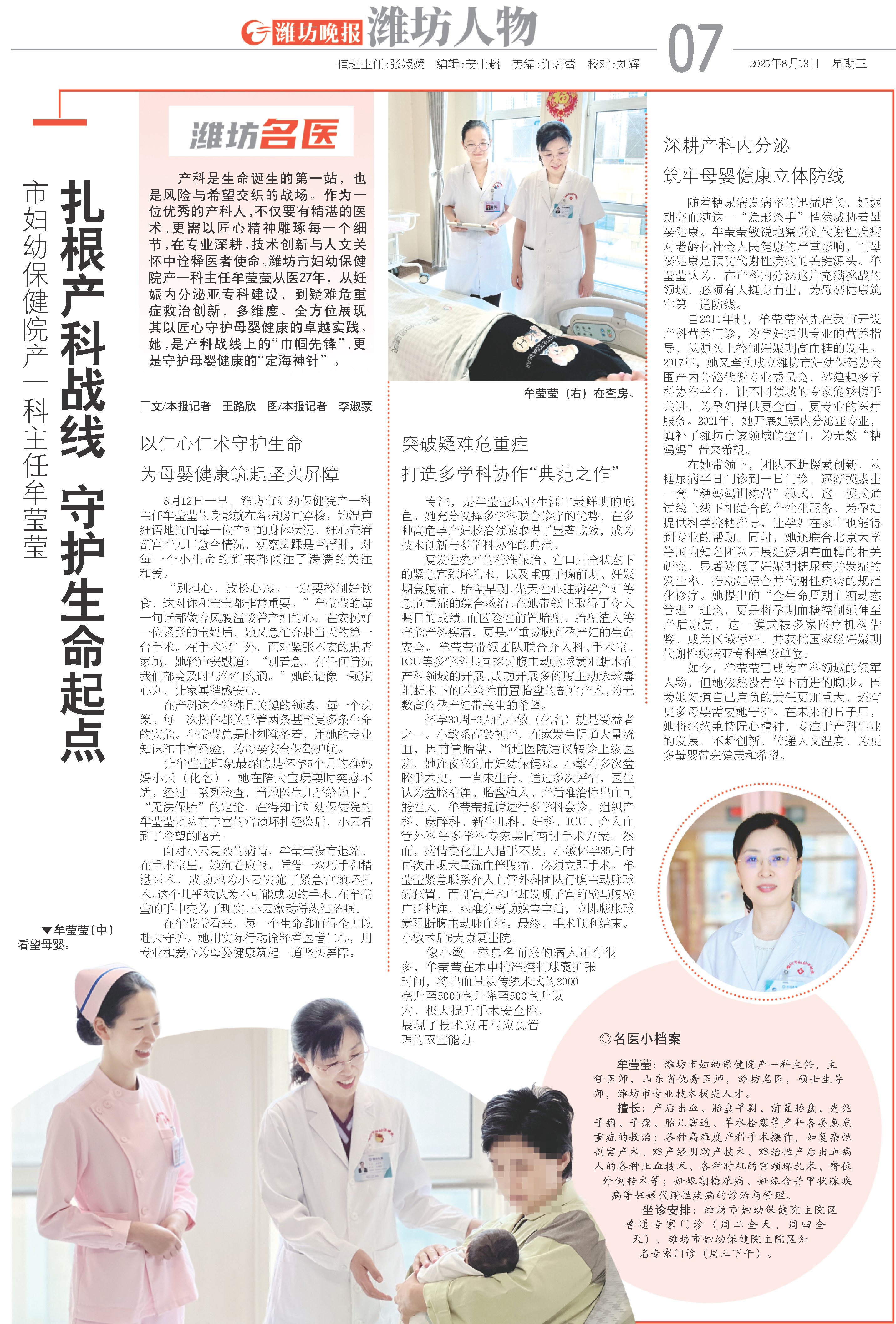 产科是生命诞生的第一站,也是风险与希望交织的战场。作为一位优秀的产科人,不仅要有精湛的医术,更需以匠心精神雕琢每一个细节,在专业深耕、技术创新与人文关怀中诠释医者使命。潍坊市妇幼保健院产一科主任牟莹莹从医27年,从妊娠内分泌亚专科建设,到疑难危重症救治创新,多维度、全方位展现其以匠心守护母婴健康的卓越实践。她,是产科战线上的“巾帼先锋”,更是守护母婴健康的“定海神针”。