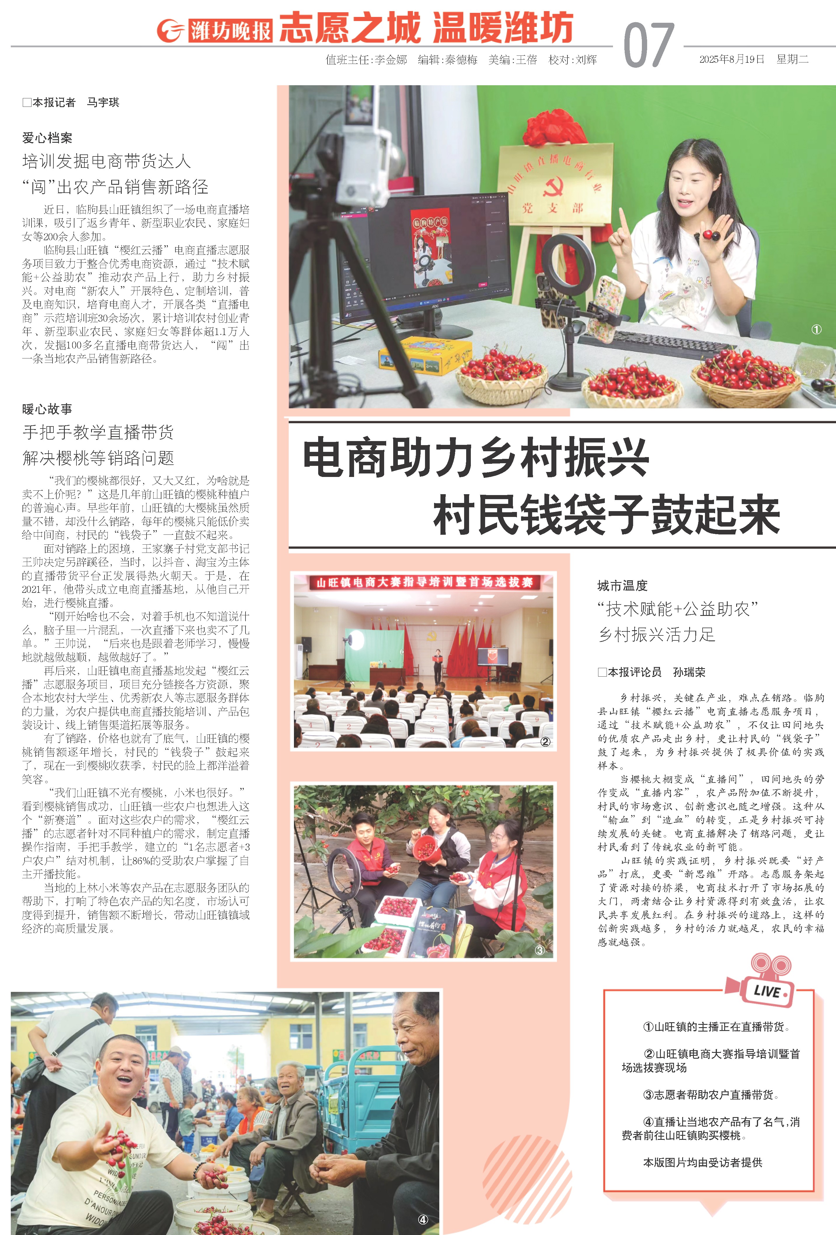 乡村振兴,关键在产业,难点在销路。临朐县山旺镇“樱红云播”电商直播志愿服务项目,通过“技术赋能+公益助农”,不仅让田间地头的优质农产品走出乡村,更让村民的“钱袋子”鼓了起来,为乡村振兴提供了极具价值的实践样本。