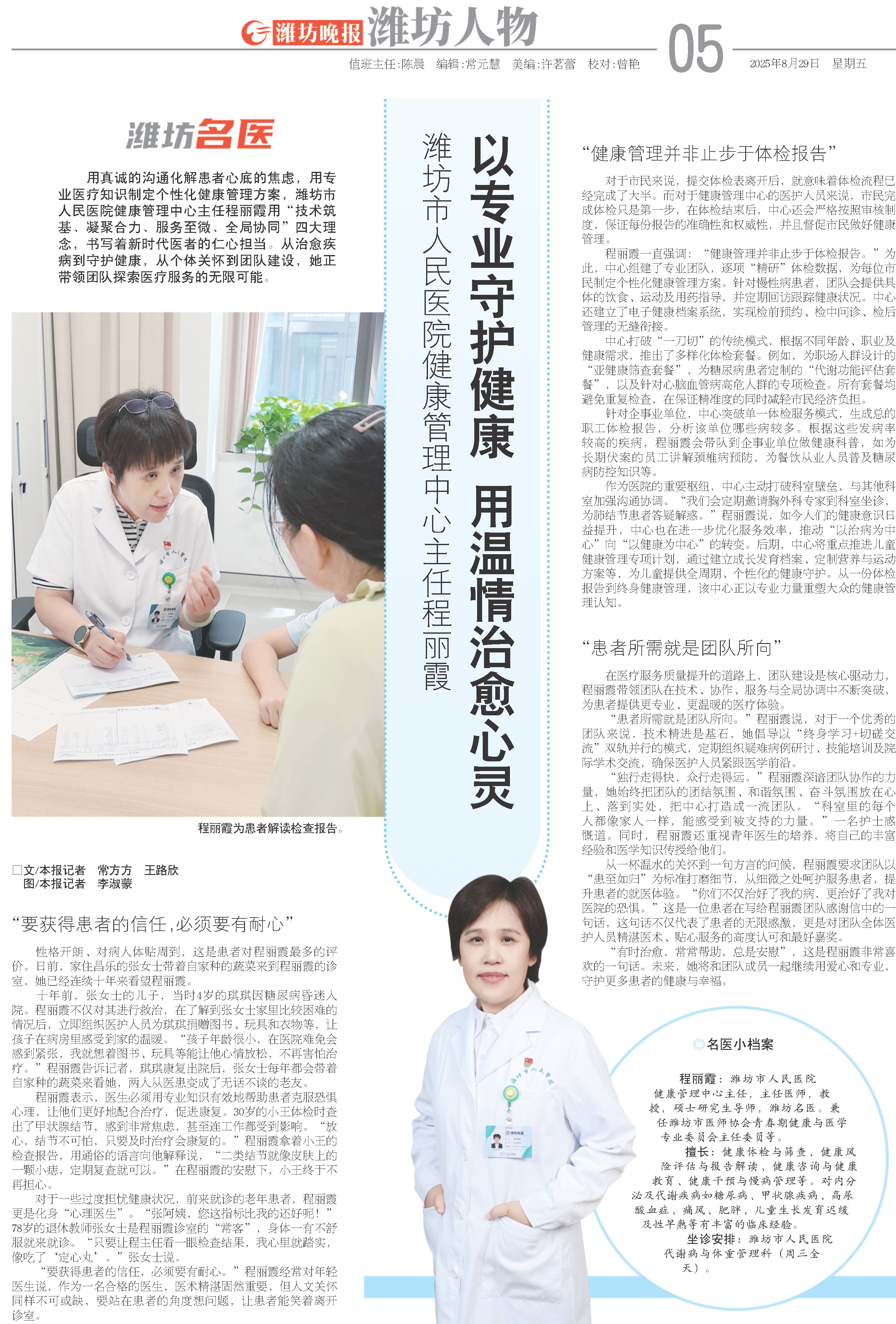 程丽霞:潍坊市人民医院健康管理中心主任,主任医师,教授,硕士研究生导师,潍坊名医。兼任潍坊市医师协会青春期健康与医学专业委员会主任委员等。