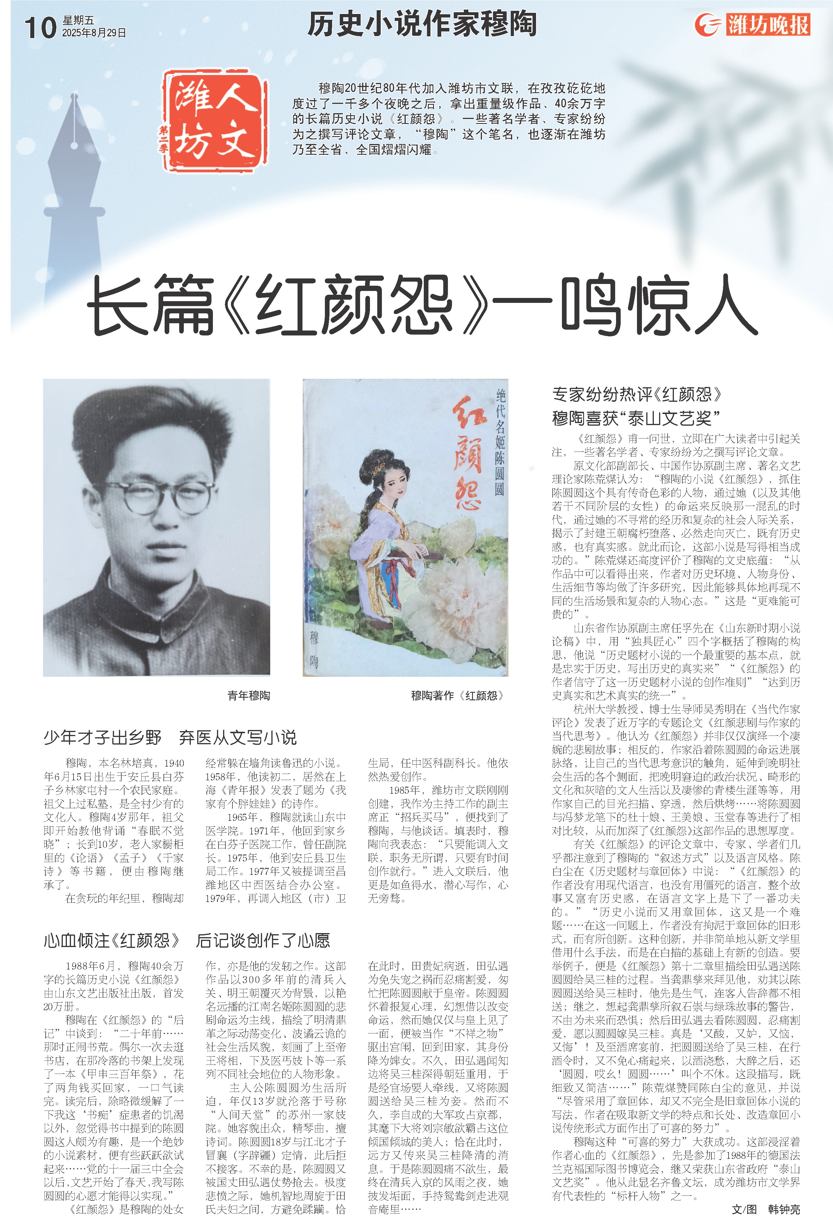 穆陶这种“可喜的努力”大获成功。这部浸淫着作者心血的《红颜怨》,先是参加了1988年的德国法兰克福国际图书博览会,继又荣获山东省政府“泰山文艺奖”。他从此显名齐鲁文坛,成为潍坊市文学界有代表性的“标杆人物”之一。