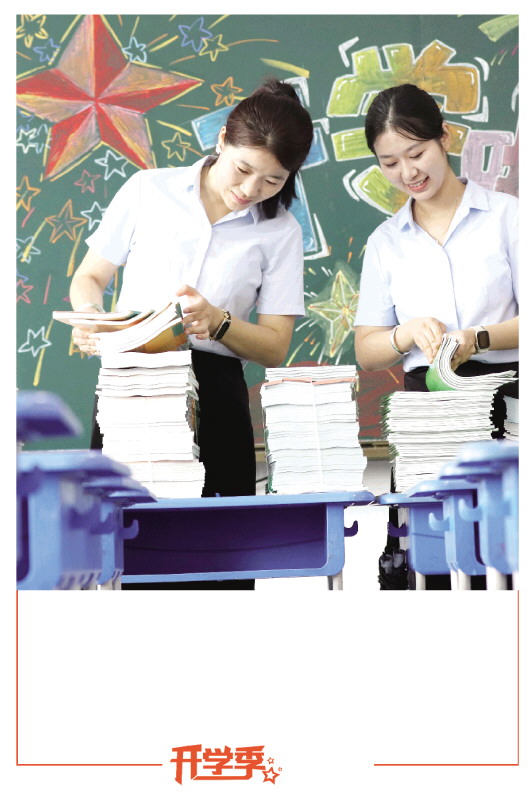 8月30日,在高密市恒涛实验小学,老师在整理新书。开学在即,社会各界做好准备工作,迎接新学期。 新华社发