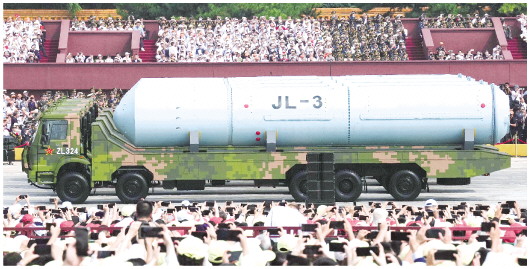 受阅的“惊雷-1”空基远程导弹、“巨浪-3”潜射洲际导弹、“东风-61”陆基洲际导弹、“东风-31”新型陆基洲际导弹,首次集中展示我军陆、海、空基“三位一体”战略核力量,是维护国家主权、捍卫民族尊严的战略“王牌”。