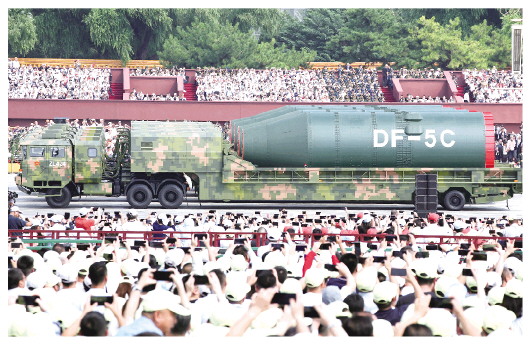 12台大型导弹运输车载着“东风-5C”液体洲际战略核导弹浩荡而来。核导弹第二方队是装备方队压轴出场的方队。
