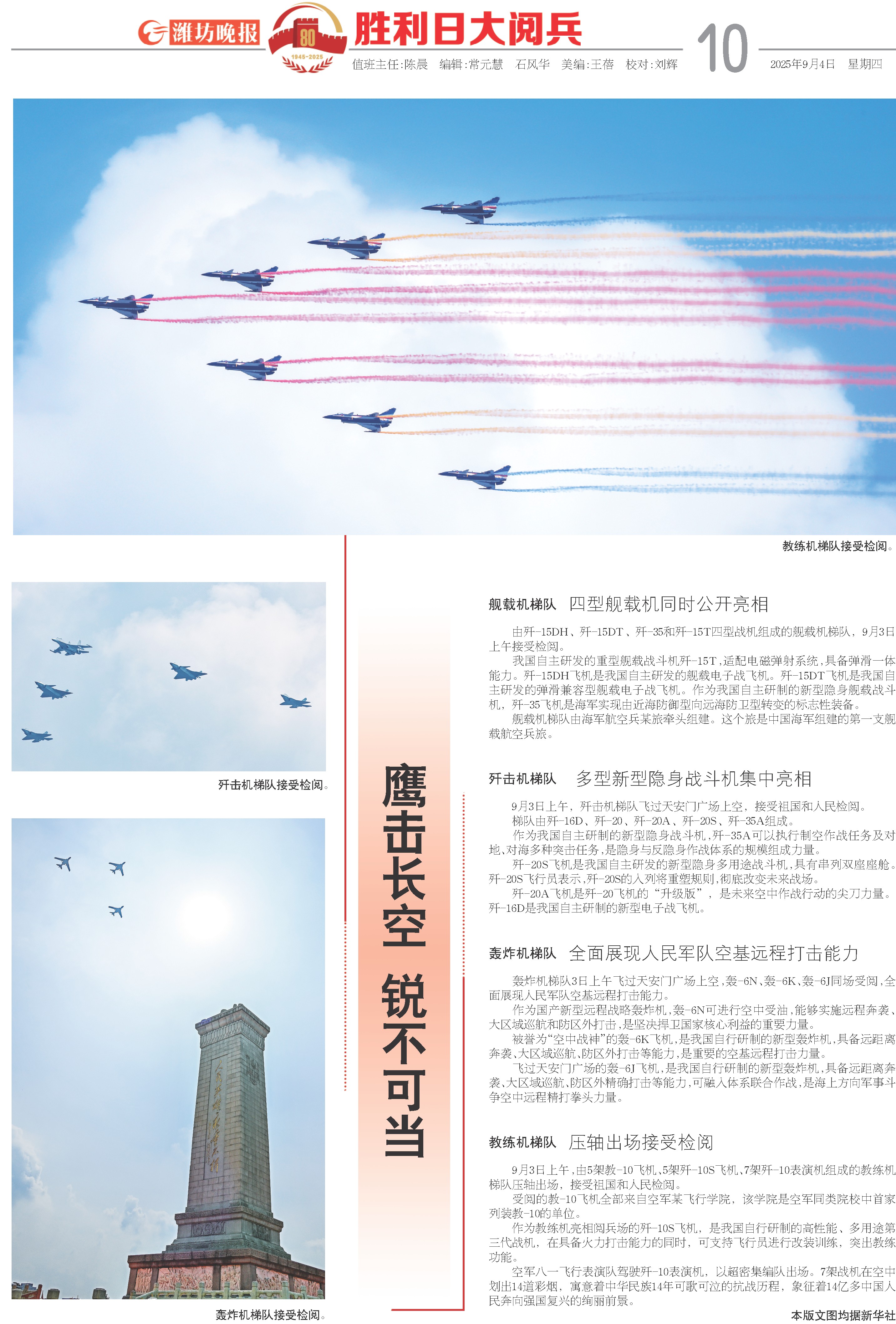 由歼-15DH、歼-15DT、歼-35和歼-15T四型战机组成的舰载机梯队,9月3日上午接受检阅。