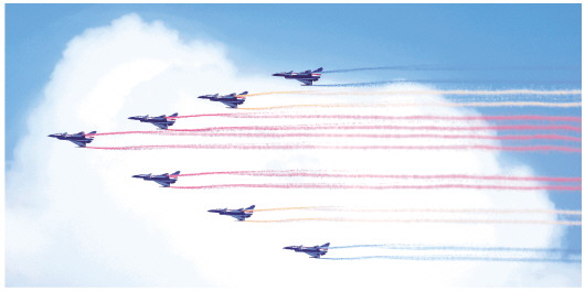 空军八一飞行表演队驾驶歼-10表演机,以超密集编队出场。7架战机在空中划出14道彩烟,寓意着中华民族14年可歌可泣的抗战历程,象征着14亿多中国人民奔向强国复兴的绚丽前景。
