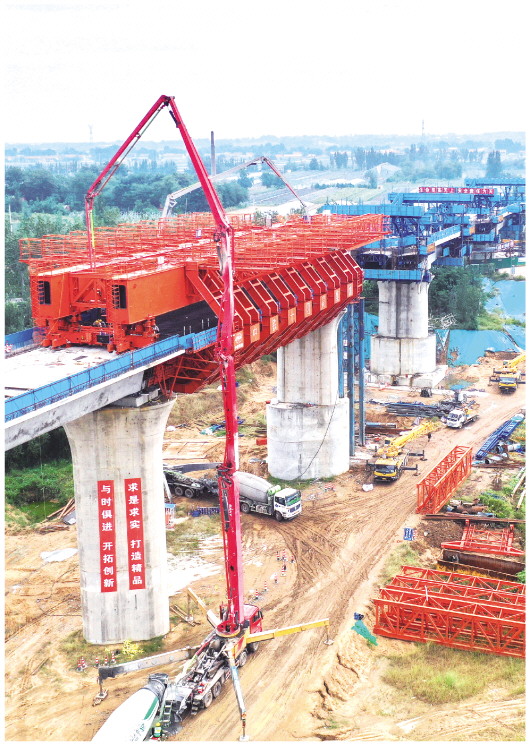 9月24日,在潍宿高铁山东段,中铁十四局施工人员在进行安丘汶河特大桥40米简支梁浇筑施工(无人机照片)。当日,国家重点项目潍(坊)宿(迁)高速铁路山东段安丘汶河特大桥十榀40米简支梁全部浇筑完成,项目承建方抢抓工期与节点,稳步推进标段施工。潍宿高铁是京沪高铁辅助通道的重要组成部分,正线全长约399公里,设计时速350公里。 新华社发