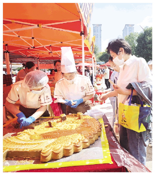生活节期间,在麦田蛋糕展区,麦田蛋糕打造的直径1米、重达80公斤、印有‘龙凤呈祥’图案的广式大月饼,一亮相就成为全场打卡焦点;9月21日,工作人员现场向市民分发这个超级月饼,300多位市民有序排队领取、品尝,赞声不断。两位外国友人品尝后,更是竖起大拇指连连称赞,成为现场暖心小插曲。