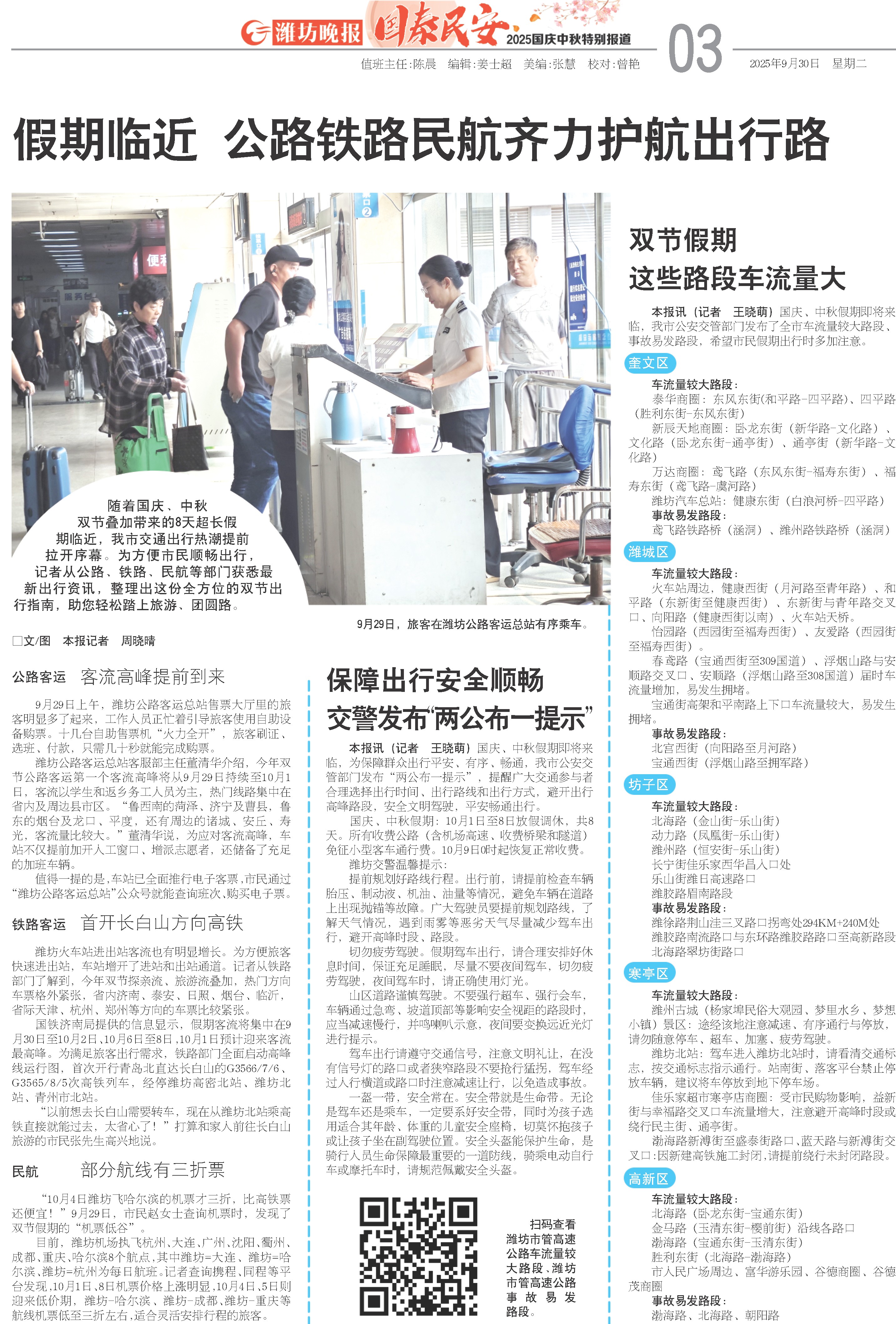 潍坊公路客运总站客服部主任董清华介绍,今年双节公路客运第一个客流高峰将从9月29日持续至10月1日,客流以学生和返乡务工人员为主,热门线路集中在省内及周边县市区。“鲁西南的菏泽、济宁及曹县,鲁东的烟台及龙口、平度,还有周边的诸城、安丘、寿光,客流量比较大。”董清华说,为应对客流高峰,车站不仅提前加开人工窗口、增派志愿者,还储备了充足的加班车辆。