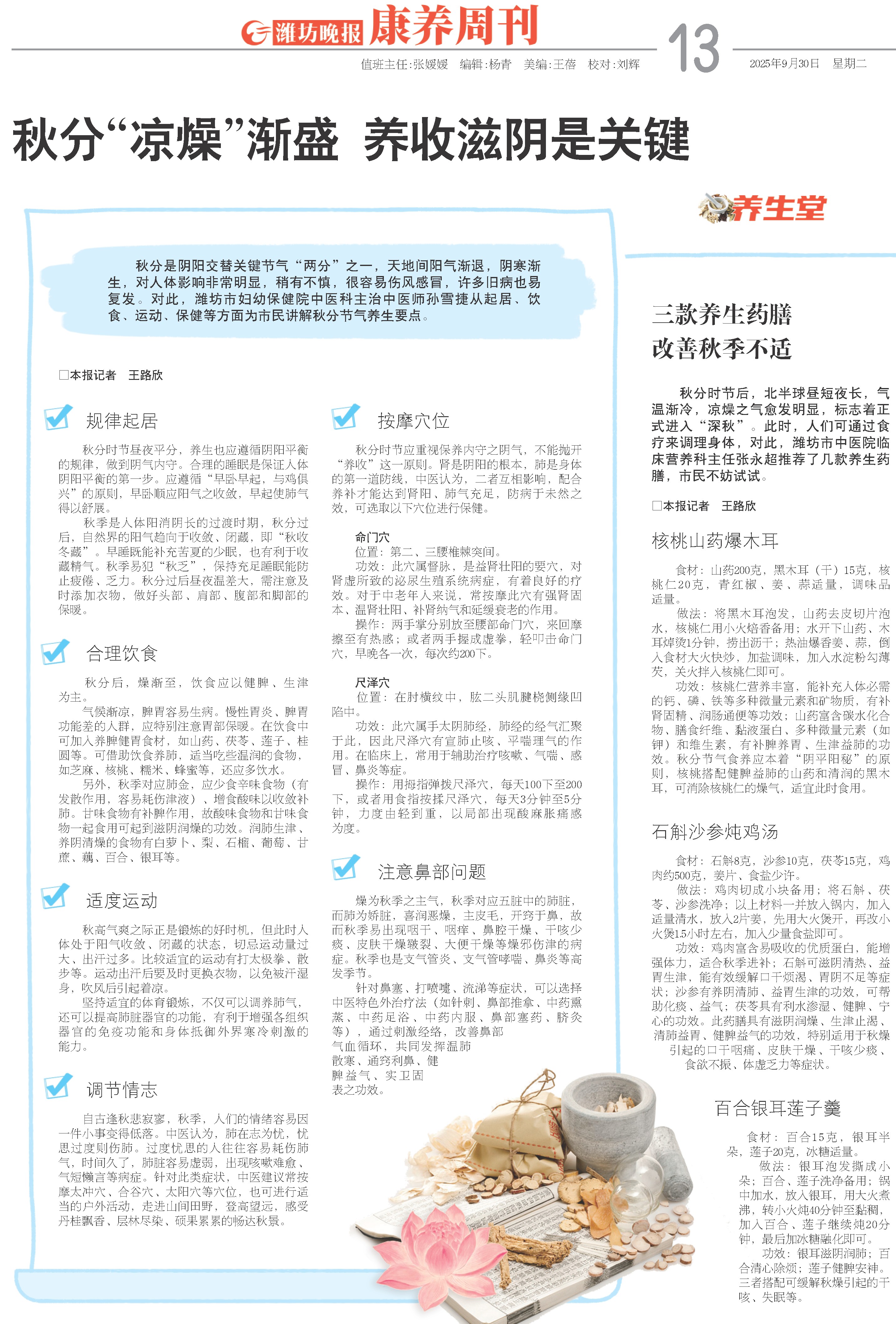 秋分是阴阳交替关键节气“两分”之一,天地间阳气渐退,阴寒渐生,对人体影响非常明显,稍有不慎,很容易伤风感冒,许多旧病也易复发。对此,潍坊市妇幼保健院中医科主治中医师孙雪捷从起居、饮食、运动、保健等方面为市民讲解秋分节气养生要点。