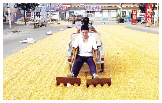 10月14日,寿光市台头镇北洋头村村民趁着天气晴好晾晒玉米。前段时间,我市出现持续阴雨天气。近几日,各地村民忙着抢收玉米,在村内空地或封闭路段剥皮晾晒,以降低天气对秋粮收储造成的不利影响。 本报记者 王来臣