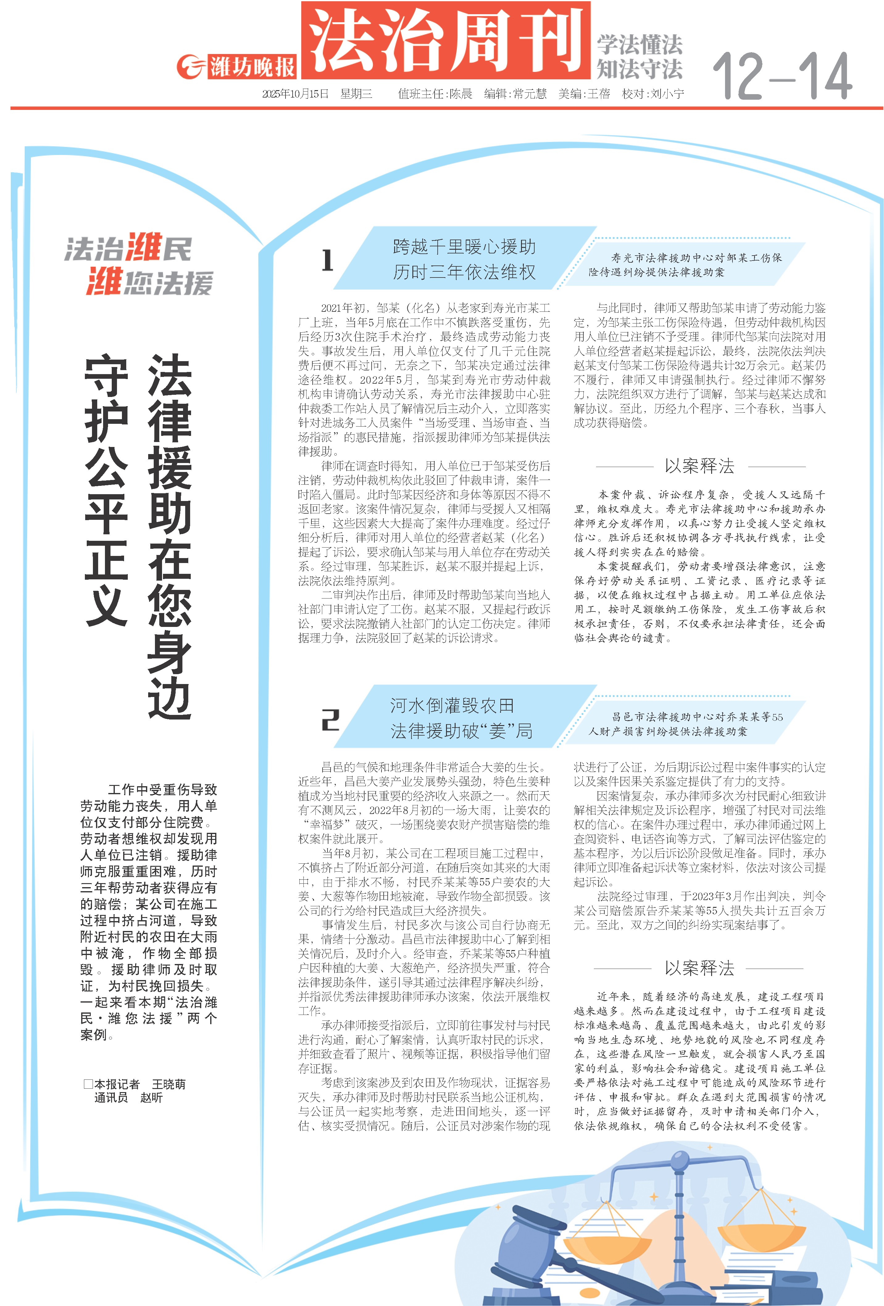 工作中受重伤导致劳动能力丧失,用人单位仅支付部分住院费。劳动者想维权却发现用人单位已注销。援助律师克服重重困难,历时三年帮劳动者获得应有的赔偿;某公司在施工过程中挤占河道,导致附近村民的农田在大雨中被淹,作物全部损毁。援助律师及时取证,为村民挽回损失。一起来看本期“法治潍民·潍您法援”两个案例。