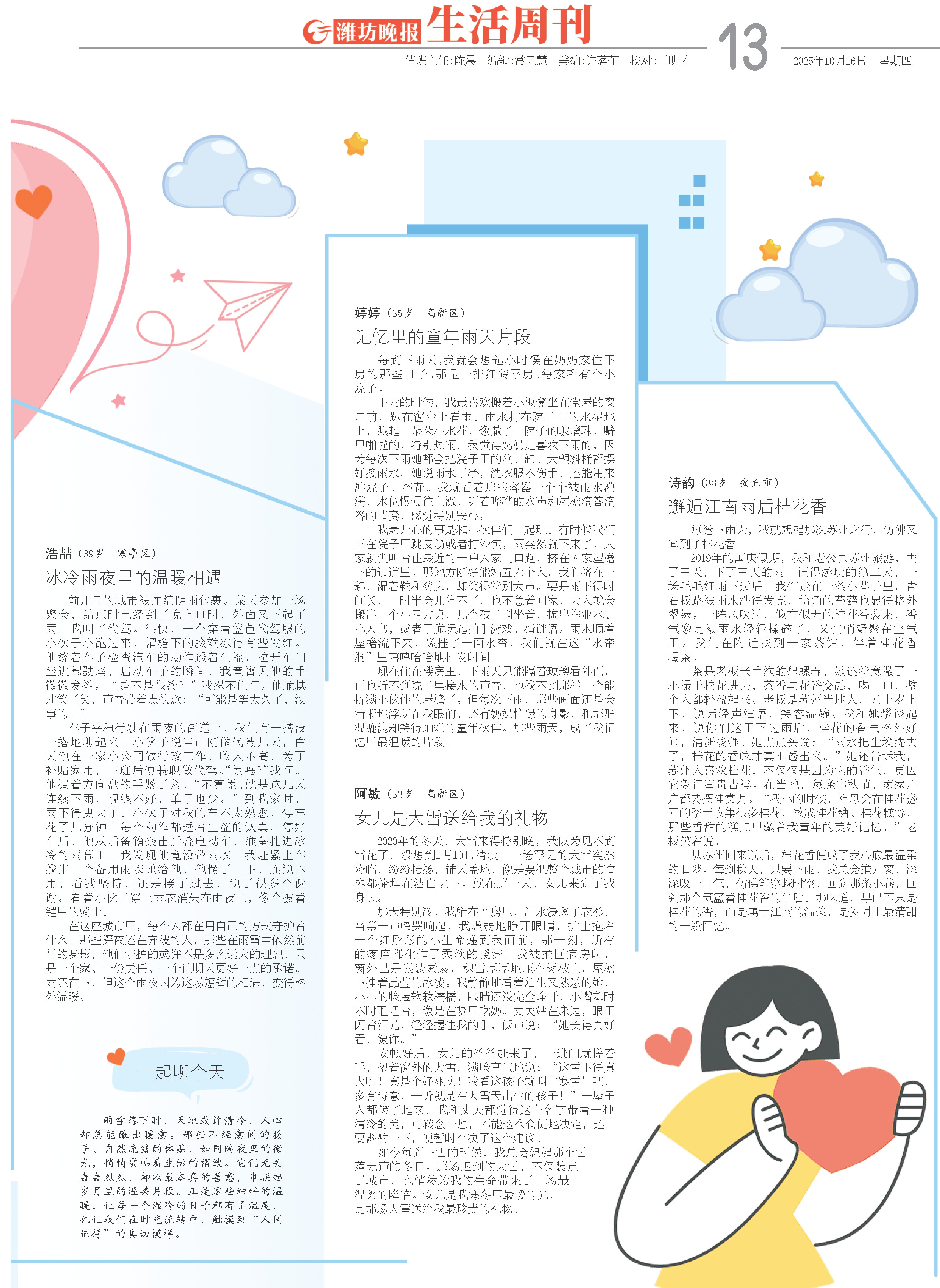 雨雪落下时,天地或许清冷,人心却总能酿出暖意。那些不经意间的援手、自然流露的体贴,如同暗夜里的微光,悄悄熨帖着生活的褶皱。它们无关轰轰烈烈,却以最本真的善意,串联起岁月里的温柔片段。正是这些细碎的温暖,让每一个湿冷的日子都有了温度,也让我们在时光流转中,触摸到“人间值得”的真切模样。