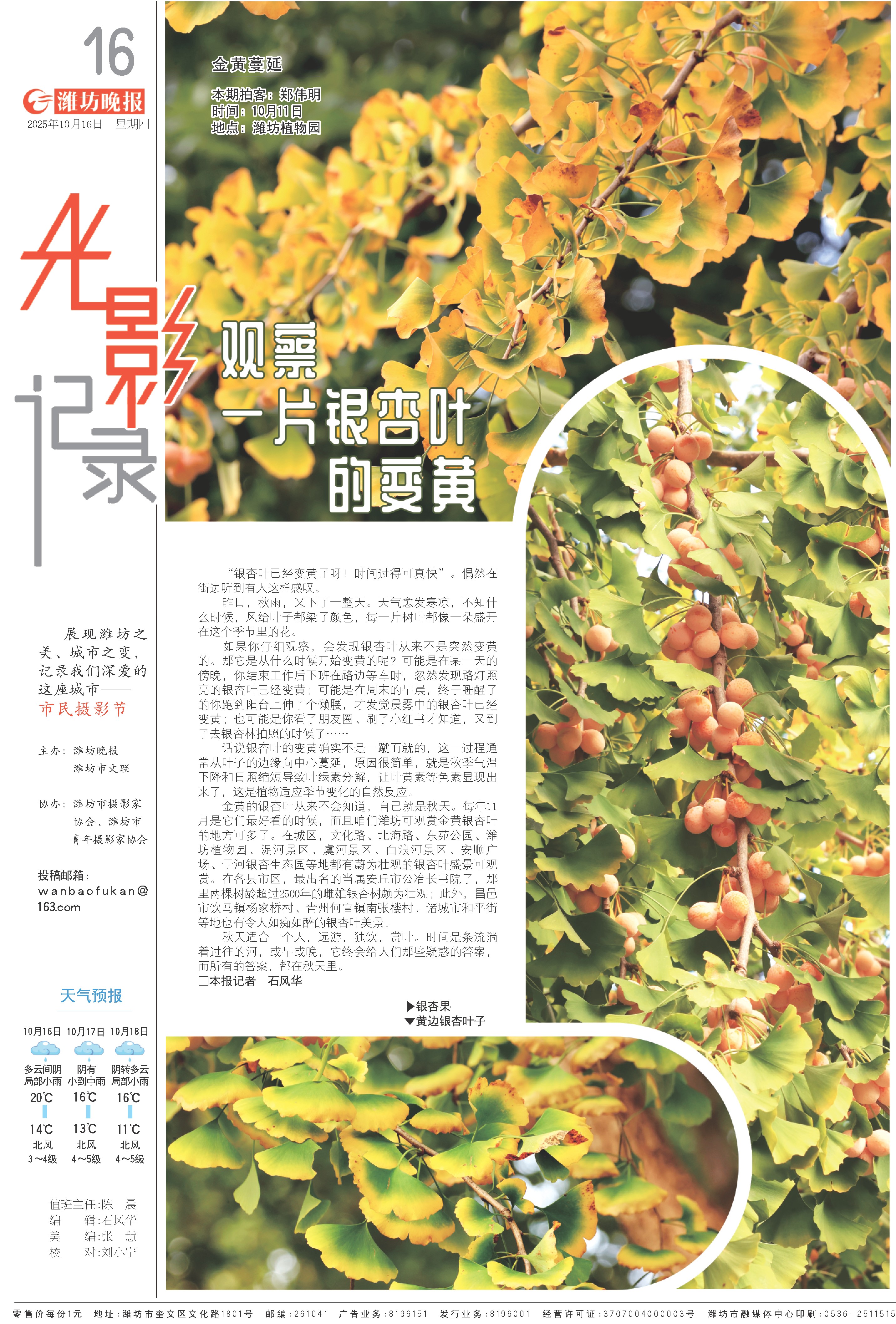 如果你仔细观察,会发现银杏叶从来不是突然变黄的。那它是从什么时候开始变黄的呢?可能是在某一天的傍晚,你结束工作后下班在路边等车时,忽然发现路灯照亮的银杏叶已经变黄;可能是在周末的早晨,终于睡醒了的你跑到阳台上伸了个懒腰,才发觉晨雾中的银杏叶已经变黄;也可能是你看了朋友圈、刷了小红书才知道,又到了去银杏林拍照的时候了……