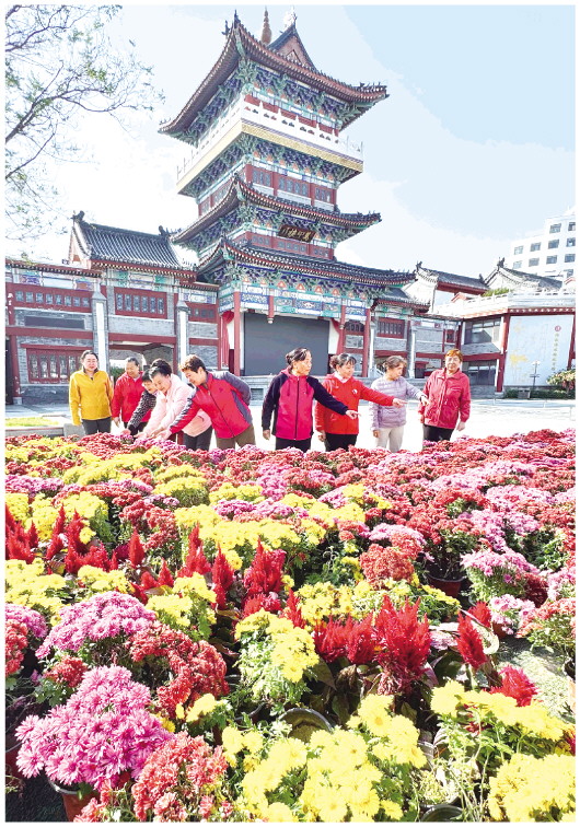 10月21日,在城区十笏园文化街区,精美的菊花景观吸引了来自潍城区城关街道曹家巷社区居民的目光。菊花是我市市花,当日,该社区开展了一场“深秋赏菊正当时”活动,社区组织居民来到户外赏菊,一株株色彩各异的菊花竞相开放,成为一道绚丽多彩的秋日风景线,令人目不暇接。 本报记者 张驰