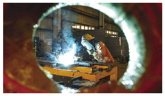 10月27日,中铁科工集团轨道交通装备有限公司技术工人对盾构机盾体配件进行电焊作业。 新华社发